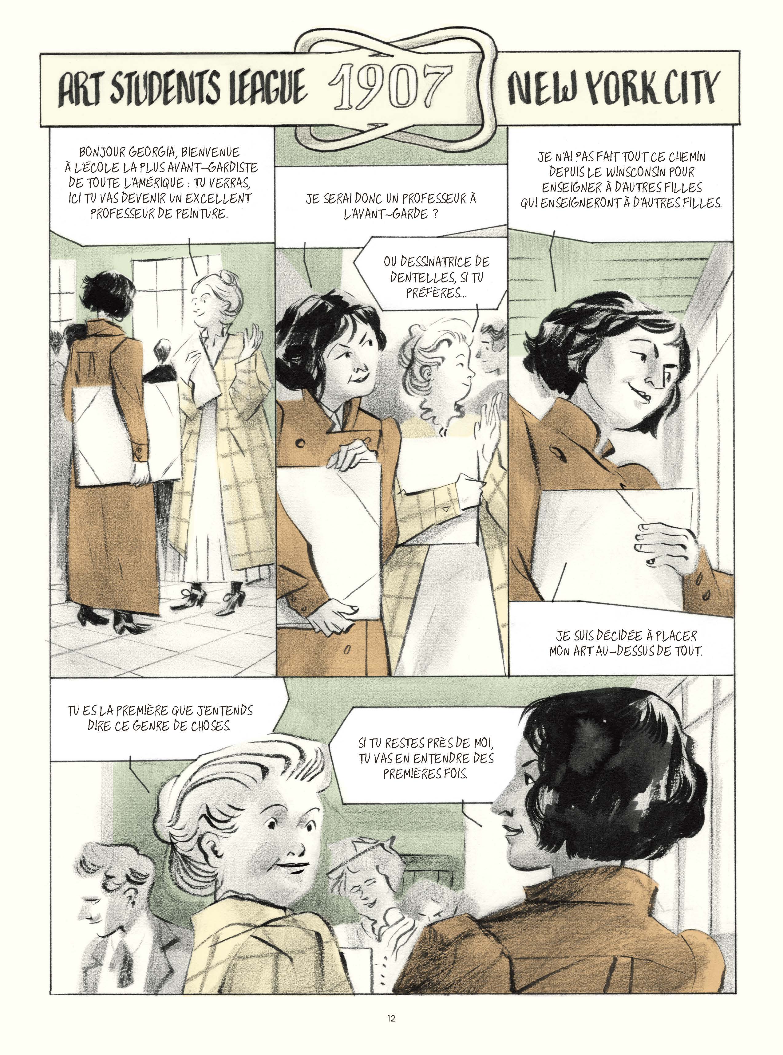 Luca de Santis et Sara Colaone avaient déjà collaboré ensemble aux éditions Steinkis avec une biographique intitulé « Leda Rafanelli, la gitane anarchiste« . Dans le cadre de la première rétrospective de l’artiste Georgia O’Keeffe au Centre Pompidou à Paris, le duo s’est reformé. A nouveau, ils vont raconter une biographie romancée d’une femme exceptionnelle qui a su laissé son nom dans l’Histoire de l’art et ce même de son vivant. Le choix narratif s’est posé sur des allées retours entre l’artiste en retrait au Nouveau-Mexique et sa jeunesse. Parler de son mari qu’elle a aimé si passionnément est indispensable. Alfred Stieglitz lui a permis de prendre assez confiance en elle pour pousser toujours plus loin sa créativité, d’autant plus si cela rapportait de l’argent. Dorénavant, elle ne veut plus être vraiment rattaché à lui qu’il l’a trahi pour une autre, plus jeune. Il faut gérer cet incroyable héritage et plus d’un individu va essayer. L’aigreur de la peintre est difficile à supporter. Les créatifs n’ont pas eu le besoin de sublimer une personnalité. Ils vont la décrire comme on parle d’elle : entière, sans demi-mesure, lunatique, cruelle et seule. Avec beaucoup d’ingéniosité, ils insèrent des références à son oeuvre à l’instar de ce crâne d’animal qui l’interroge. Par rapport au contexte historique, il lui a fallu se battre pour s’imposer comme artiste femme là où l’on ne pensait que c’était un domaine masculin. Malgré une grande richesse dans les recherches, dans la façon de raconter, on reste sur sa faim. On n’a pas vraiment l’impression d’avoir cerné un personnage complexe.
