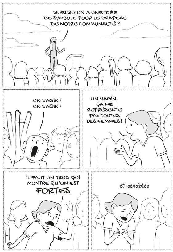 On ne pouvait espérer un pamphlet plus investi qu’un récit où les hommes auraient tous disparus. La survie de l’être humain pourrait alors remise en question? Un peu mais pas tant que cela. La science vient en renfort pour trouver des solutions. Et en plus, il reste du stock de sperme dans les banques. Heureusement que les hommes adorent se masturber et souhaitent laisser une trace d’eux dans l’Histoire. Etrangement, c’est toujours une fille que le hasard choisi. Des sociétés vont se construire sans pénis et le monde ne s’est pas écroulé. Quoi la phallocratie est une construction mentale? Pour ceux qui avait un doute, le titre de la bande dessinée donne directement le ton : « Woman World ». Une femme nue avec drapeau est un indice supplémentaire. En effet, il était impossible d’identifier les cuisses de Beyoncé. Comment ne pas y voir un clin d’oeil au titre « Run the world (girl) »? Aminder Dhaliwal nous met au coeur d’une communauté qui s’interroge sur son sort, son passé, la notion d’amour, d’amitié, de travail… Elle croise le regard de plusieurs générations avec une petite fille, des trentenaire et une grand-mère. Chacune a expérimenté la notion de féminité à sa manière et tente de la projeter. Sans oublier de réfléchir à ce que pouvait être un homme, son utilité et sa place. Malheureusement, il reste peu de trace. Quel sens de l’humour et de la dérision qui va faire plaisir à de très nombreuses lectrices. De plus, grâce à son trait fin, sans couleur, elle créé un monde simple et chaleureux. La diversité se montre et cohabite à merveille. Une femme qui a subi une ablation de seins et dont il reste des cicatrices ne sera pas stigmatisée et en ressentira pas de pression sociale. Les saynètes se succèdent et dynamise cet ouvrage de 200 pages. Quand on arrive à la fin, on sort avec le sourire et ravie d’avoir rencontré des héroïnes aussi vraies et attachantes. Attention spoiler pour messieurs. Même en ayant un utérus, on peut discuter avec intelligence sans penser forcément à un mec.