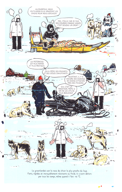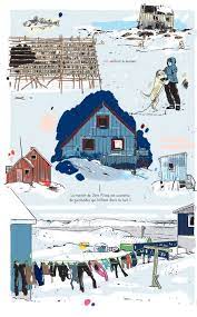 Fleur s’est embarquée sur le Manguier pour une résidence d’artiste. Le remorqueur volontairement pris dans les glaces de la banquise, l’équipage part à la découverte de cette gigantesque île et de ses habitants. L’auteure nous emmène avec elle pour comprendre les glaciers, les Inuits, une culture et un environnement extraordinaires, entre tradition et modernité. Des voyages en motoneige sous l’aurore boréale aux discussions triviales avec les autochtones, se déroule alors sous nos yeux ébahis cette île gigantesque pleine de mystères.