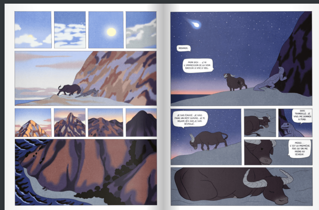 Un buffle pousse de toutes ses forces sur la paroi, enfonçant sa tête dans la roche pour déplacer une île ; c’est qu’une comète, qui file dans le ciel, viendra bientôt heurter la surface et exploser ce bout de terre. Le buffle le sait, il l’a vu dans ses rêves, c’est ce qu’il dit au varan qui le rejoint dans son effort.