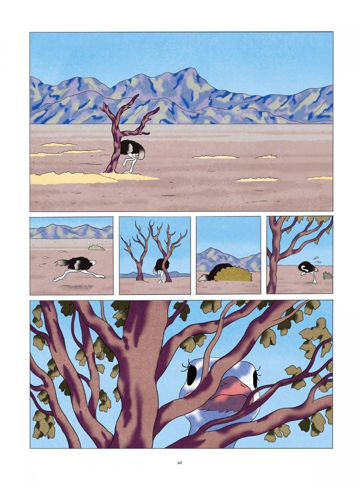 C’est ainsi que commence ce récit, formé de plusieurs histoires courtes où les animaux occupent seuls le devant de la scène. Au fil de ces récits, on suit un étourneau perdu en pleine migration, une autruche qui doute, un jeune éléphant apprenant l’histoire du monde… Cet ensemble de paraboles d’une grande force d’évocation nous replonge dans les délices des fables de La Fontaine autant que dans les images tourmentées du Livre de la Jungle. Habilement, Jérémie Moreau parvient à décentrer notre regard et à dépasser l’apologue moral humaniste ; les animaux deviennent des vivants, aux existences et aux beautés singulières.