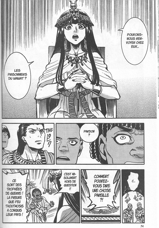 Hatchepsout ne maîtrise pas encore tous les codes pour s’affirmer à son poste de reine. Surtout qu’elle voudrait ne pas être l’épouse de mais être la reine qui dirige. Il va falloir qu’elle fasse les bons choix et surtout s’entourer des bonnes personnes. Les femmes qui servent uniquement au plaisir sexuel du pharaon espère toutes donner naissance à sa descendance mâle. Si cela venait à se faire, que deviendrait la chère reine? Un accident est si vite arrivé à cette époque avec une chute de hauteur, un égorgement, du poison…. Les enjeux sont de taille. Dans ce tome, l’héroïne commence à percevoir qui sont ces ennemis et ces soutiens. Son bras droit, charmant et brillant, est éloigné et remplacé par quelqu’un de moins talentueux et investi. Que cela ne tienne car ils se retrouveront plus tard, le destin les réunira forcément. On observe une note de romance qui ne pourra jamais éclore. Chacun doit rester à sa place. Chie Inudoh continue avec intelligence à poser le cadre dans ce tome le contexte historique mouvementé. Les jeux de pouvoir sont la clé de la réussite et c’est quelque chose de difficile à manier, surtout quand on rentre juste dans la partie. Hatchepsout apprendra à ses dépends que la gentillesse et la bonté n’ont pas vraiment leur place. Comment gérer le fait d’avoir du sang d’innocentes sur les mains? Comment ne pas s’attacher à une personne avec des principes et altruiste? Elle va devoir prendre des décisions fortes pour prendre le pouvoir. A quoi est-elle prête à renoncer? Certainement pas à réfléchir, à penser autrement la stratégie, les alliances, la paix, le commerce… Ce qui est certain ce tome annonce une suite des plus dynamique et des plus audacieuse. Jusqu’où allons-nous aller?