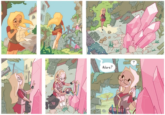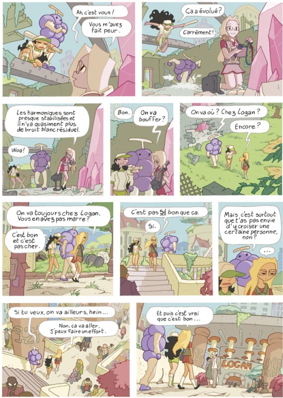 J’avais le vague souvenir de Lou dans les premiers tomes de la série, il y a quelques années de cela. Je me suis dit pourquoi retrouver cette adorable jeune fille quand le tome 6 est arrivé dans mes mains. Quelle n’a pas été ma surprise à sa lecture. Je croyais que l’on suivait une fille de ces premiers jours jusqu’à l’adolescence. Et là, elle est étudiante, fait des relevés pour le gouvernement sur des cristaux rose présent dans la ville et garde son petit frère, obnubilé par les dinosaures. Tristan est là mais sous l’apparence plus enfantine par rapport au personnage principal. Que c’est-il passé en quelques tomes? Sommes nous dans une fiction que la mère aurait rédigé? Qu’est-ce qui a fait qu’il y a un virage à 360° dans le récit? Cette question ne me quitta jamais en tournant les pages. Où est-ce que Julien Neel veut nous emmener? que veut-il nous dire? nous faire comprendre? Je l’ignore totalement. Je me sens en dehors d’un récit pas très palpitant. Voir une jeune fille faire la nounou de son petit frère n’a rien de très intéressant. A moins que l’on pose ici un cadre pour un retournement de situation prochain? De toute façon, je n’ai aucune envie d’avoir la réponse. Un choix risqué de tout réinventer car des lecteurs vont aussi s’arrêter en chemin. Par contre, le dessinateur a conservé ce qui fait le charme de sa création avec son dessin si chaleureux et ces couleurs apaisantes.