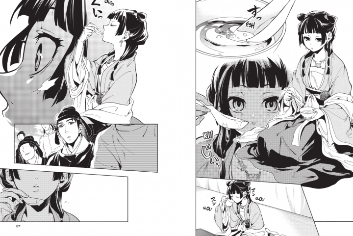 Itsuki Nanao nous permet de mieux faire connaissance avec son héroïne. Mao Mao doit faire sa place auprès d’une des favorites pour la soigner. Pourquoi l’empereur a t’il fait appel à elle plutôt qu’à un de ces médecins personnels? Voulait-il se débarrasser de deux personnes ou pas? Nous n’en saurons pas plus pour l’instant. Mais la pression est important au sein des favorites. Personne ne veut que sa concurrente tombe enceinte du descendant du royaume. Les dames de compagnie veillent du mieux qu’elles peuvent. Notre héroïne apprend le boulot et se rapproche de ces nouvelles amies. Très vite, elle arrive à se faire aimer avec sa personnalité si ouverte et si innocente. Jinshi devient plus important et son attitude est troublante. Pourquoi lui offre t’il un cadeau? Pourquoi est-il troublé par son honnêteté? Aucun doute que la scénariste a prévu de nombreux rebondissements par la suite. En tout cas, elle a tout fait pour que l’on s’attache et que l’on souhaite poursuivre. Les dessins de Nekokurage restent très agréable à lire avec son trait très précis et délicat. Elle doit adorer les gros seins car nous avons le droit à une très grosse poitrine qui rebondit. Le duo de choc fournir un gros travail qui ne peut que ravir les lecteurs qui voudront poursuivre leur chemin avec elles.