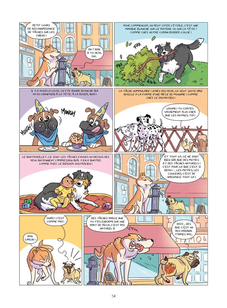 Les fans des séries chez Bamboo de type « Les assureurs », « Les campeurs », « Cath et son chat » sont habitués de trouver un thème et une série de gag. D’ailleurs, Christophe Cazenove est un habitué du genre aussi bien sur la forme que sur le fond. Alors « Les chiens en bd » peut dérouter quelques lecteurs. Même s’il y a une trame humoristique, l’approche reste pédagogique. Chaque planche une histoire et une information. Elle concerne aussi bien la fonction de certains chiens selon les époques, les croisements réalisés, le dressage, le fonctionnement de leur corps, les particularité selon les races… Aucun doute que les propriétaires ne verront plus leur compagnon du même regard. La bande dessinée ne s’adresse pas un public jeunesse. Même si l’on s’amuse surtout de la maladresse du carlin, on nous donne des enseignements très concrets. D’ailleurs, cela est cohérent avec le le dossier final réalisé avec Esprit Dog, un site qui parle d’éducation canine. Si l’on a apprécié le premier tome, les lecteurs seront ravis de la continuité. Le graphisme assez classique est très plaisant avec des formes arrondies, des grands yeux rendent les histoires plus mignonnes et attachantes. Les couleurs vives contribuent à capter notre attention. Les pages se tournent simplement avec curiosité qui nous charge de connaissances savantes pratiques.