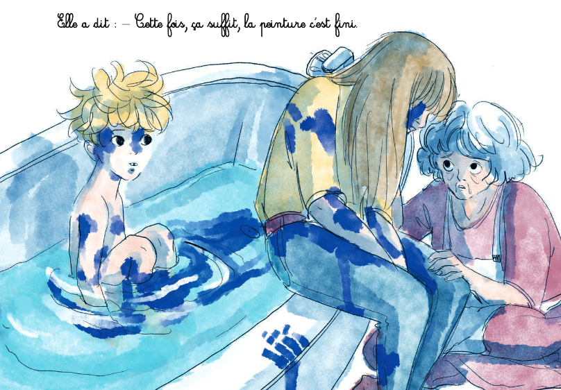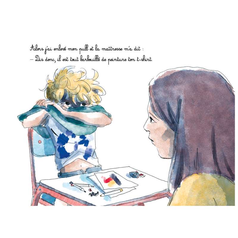 Dès qu’il y a des sujets assez sensibles et tabous se posent la question de la représentation. Comment en parler en trouvant les bonnes limites? Olivier Dupin et Quentin Zuttion ont décidé d’allier leur talent pour évoquer la violence domestique. La pédagogie et la poésie sont la clé de leur ouvrage « Barbouillé ». On va rencontrer un charmant garçonnet à l’école où la maitresse remarque qu’il y a beaucoup de traces de couleurs sur son tee-shirt. Il est maladroit et papa aime beaucoup le bleu. Parfois il a du bleu sur le visage, les bras et ailleurs sur le corps. Papa quel peintre passionné. Surtout qu’il n’oublie pas maman. Puis très vite, on apprend que le paternel n’est nullement un artiste. C’est un homme violent qui s’en prend à sa famille. Une façon très élégante et poétique de parler d’un sujet toujours d’actualité et qui concerne énormément de famille. Le récit mignon tourne au drame où un échappatoire est possible. Les dernières pages expliquent la maltraitance avec des mots simples et accessibles. Le tout avec des dessins pleins de délicatesse et de finesse. On se dit que c’est le genre d’ouvrage qu’il faut faire lire à tous les âges et mettre à disposition dans les bibliothèques scolaires et municipales.