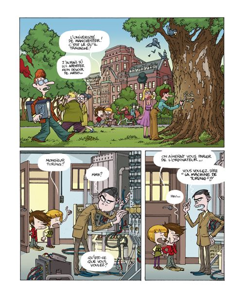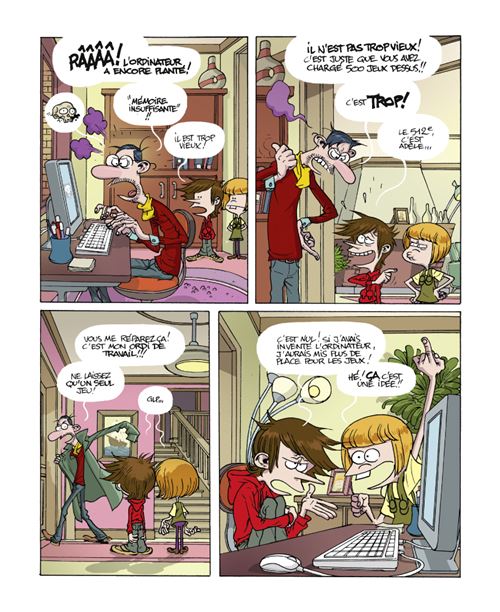 L’album a été réalisé dans le cadre d’une exposition en Suisse. Mais si on ne le sait pas, cela ne nuit nullement à la lecture. On retrouve des personnages déjà créé dans la série avec Adèle et Marvin. Ces héros suivent leurs envies quand ils font face à une difficulté. Quand leur père leur demande de nettoyer l’ordinateur des jeux qu’ils ont installé ou quand il faut aller jouer du piano, il faut qu’il trouve un échappatoire. Pas d’autre solution que d’aller dans le temps pour demander aux inventeurs de changer les choses pour leur faciliter la vie. Deux enfants égoïstes qui pensent que les choses devraient tourner qu’autour d’eux. Aucun doute que les lecteurs pourront facilement s’identifier à leur semblable. Une histoire par invention est une approche assez pédagogique. Ce qui est raconté est vrai dans les noms, les dates, la concurrence. Par contre, il y a quelques erreurs comme l’invention du cinéma. Le premier film des frères Lumières n’était pas la sortie d’usine et les quelques spectateurs présents ce jour là ne se sont pas enfuis en criant. En effet, un article dans la presse le relatait. C’est ce que l’on appelle de la communication pour appâter le chaland. Même dans la représentation, les gens n’étaient pas assis face à un papier contre un mur. C’était un tissus blanc mis au milieu du bar car l’image était visible des deux côtés permettant ainsi plus de spectateur. La réalité est beaucoup moins vendeuse. On peut demander pourquoi est-il nécessaire de faire des références à la religion comme écrire la Bible avant dieu par exemple? Dieu repose sur une croyance et non une réalité. Et les livres de foi ont tous été écrit par des hommes et personne d’autre. Sinon, c’est ingénieux de mettre des références à la bande dessinée faisant partie des choses importantes. Rien de tel pour faire connaître aux enfants Töpffer ou Gaston Lagaffe. La frise chronologique à la fin est très bien pensée et complète très bien les aventures précédentes. Un livre qui fera plaisir à votre progéniture pour titiller leur connaissance du monde.