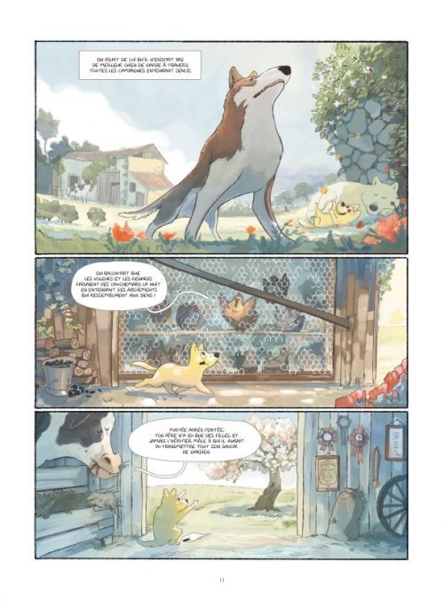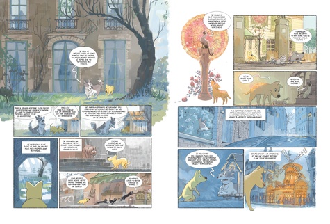 Naïvement, on peut croire que comme le titre contient le mot éco que cela va traiter d’écologie. Pourtant il suffisait de regarder la couverture pour y voir tout autre chose. On voit une chienne qui peint avec ces pattes en regardant deux femmes qui évoquent forcément « Les coquelicots » de Monet. Le sujet est par conséquent les impressionnistes. Ne vous attendez pas à trouver le récit de ces artistes via des animaux aux comportements humains. On suit une chienne de la campagne qui essaie de faire de son mieux pour garder les animaux de la ferme comme son père. Mais elle n’y arrive pas vraiment ce qui l’amène à être expulsé. La voilà à devoir se débrouiller. Qu’importe car un monde de couleurs s’ouvre à elle. A Paris, le hasard va lui permettre de devenir artiste, se faire des amis, se rapprocher de sa famille et avoir un avenir. Bien entendu, tout cela ne se fait avec facilité. Les embuches sont très nombreuses et vont être surmontés. Une lecture mignonne qui se lit rapidement. On aurait aimer des problématiques plus ardus, plus complexes car tout semble se résoudre très vite et positivement. Ce qui reste appréciable repose sur le choix de ne pas faire une histoire d’amour. De plus, Ecoline est une chienne artiste et non un mâle fort et bagarreur. L’angle est plus basé sur le contexte social du Paris du 19ème où la misère côtoie le merveilleux avec Montmartre, le Moulin Rouge, les guinguettes… Une façon élégante de parler des artistes impressionnistes bien que les œuvres de l’animal se vendent bien contrairement aux artistes innovants de cette époque. On a éludé aussi l’alcoolisme, la prostitution des mineurs, les mères maquerelles, la violence… En effet, le côté choupinou sera plus sombre. Pourtant la réalité n’est jamais colorée que d’arc-en-ciel de belles choses. Stephen Desberg a pourtant l’habitude de traiter des récits sombres. Teresa Martinez propose un magnifique univers graphique avec des formes arrondies, des couleurs pastels… qui contribuent à faire du jolie et de l’agréable.