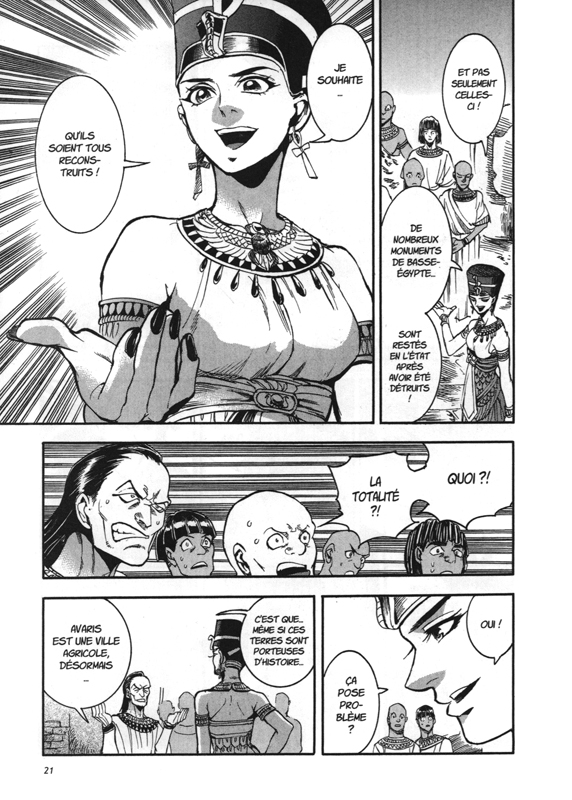 Une fois que l’on commence cette série, on a envie d’aller plus loin. Hatchepsout veut devenir pharaon et pour cela elle a déjà tué son mari. Maintenant, elle essaie de guider le prince Djehouty malgré ces 3 ans. Mais ces opposants font tout pour l’avoir dans leur poche. Et ils arrivent très bien en l’endoctrinant dans le culte de la violence et dans l’attachement à un homme qui le pousse à se surpasser. Comment ne pas voir dans cette attitude le portrait de son père, cruel et sans pitié. Il faut agir et vite. Est-ce possible? Peut-elle encore gagner la confiance de cet enfant? A moins qu’il y a une autre alternative? Par conséquent, elle doit d’entourer d’alliés et des fidèles. Par chance, son meilleur atout vient de réapparaître et il est prêt à tout pour elle. L’amour est-il la clé? Une femme a t’elle la possibilité de s’en sortir sans homme? Toute la société repose sur ce système. Vouloir tout changer demande beaucoup de diplomatie. On apprend de ces échecs pour avancer et s’endurcir. La conquête du pouvoir n’est pas une tâche facile. Les envieux ne manquent pas. Mettre en place une stratégie n’a rien de reposant. Chacun avance des pions avec précaution. Une fois encore Hatchepsout n’arrive pas à son objectif. Chie Inudoh arrive très bien à construire son scénario pour faire monter le suspens. Le graphisme est toujours aussi précis, riche et dense. On peut se demander pourquoi ces gros plans sur des poitrines et le corps mince des femmes. Est-ce pour attirer un public d’hommes plus avides d’images érotiques voir sexuelles? Une intrigue qui évolue progressivement pour créer de la tension et pour ouvrir le champ des possibles. Une nouvelle alliance va t’elle donner un nouveau souffle?