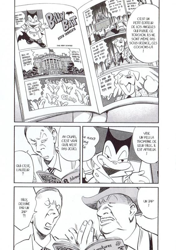 Nous revenons aux Etats-Unis où l’on retrouve Kevin Yamagata. Le petit jeune homme n’est pas en grande forme. L’esprit de la chauve souris l’habite et prend possession totale de son esprit. Il ne peut pas échapper à ses injonctions. Pour lui échapper, il boit jusqu’à l’inconscience. Des hommes influents veulent réduire au silence ce comics à succès. D’ailleurs, ils ont créé une copie grand public toute gentille et mignonne. Le détournement a été jusqu’à la création d’un parc d’attraction. Qui ce cache derrière ce plagiat? Naoki Urasawa et Takashi Nagasaki ont su exactement qui mettre. Quand on regarde à quoi ressemble l’animal qui mènent des enquêtes, on pourrait dire qu’il a des airs de Mickey. Un choix bien entendu qui n’est pas innocent. D’ailleurs, on voit le visage de Walt Disney qui bien entendu a un pseudonyme Chuck Culkin. Un homme influent qui a une vision très audacieuse et qui a su s’imposer. Ce n’est pas la seule figure de la culture américaine qu’aborde les mangakas. Dans le tome précédent, ils avaient abordés des évènements grave qui allaient bouleverser l’ordre américain. Kevin écrit dans sa version ce qu’on lui susurre et l’Histoire s’écrit véritablement en parallèle. Et si Lee Harvey Oswald n’était qu’un bouc émissaire? Des agences gouvernementales sont là-dessous. Les scénaristes maîtrisent parfaitement l’Histoire américaine pour la décortiquer avec précision et beaucoup de faits réelles. Surtout qu’en période de guerre froide les tensions sont très prégnantes. Sans omettre cette haine de l’asiatique qui se font par des termes comme « le jap » ou des références à Pearl Harbor. Le culte de l’homme blanc et de l’américain supérieur au reste du monde se fait très bien ressentir. Un terreau très fertile pour manipuler les esprits simples prêts à croire n’importe quoi pourvu que cela soit simple et discriminant. La haine se cultive assez facilement. Billy Bat symbolise bien plus que l’esprit malin, un être futuriste… Il incite les autres à se révéler pour devenir un héros de la nation ou un homme de pouvoir. Qui écrit l’Histoire? En tout cas, le récit est d’une grande richesse et incite à réfléchir. Jusqu’où peut-on aller? Que va nous réserver Kevin Yamagata par la suite? Y a t’il vraiment une gentille et une méchante chauve souris? N’est-ce pas les deux mêmes côtés d’une pièce? Aucun doute que nous aurons d’autres questionnements pour nous secouer les neurones.