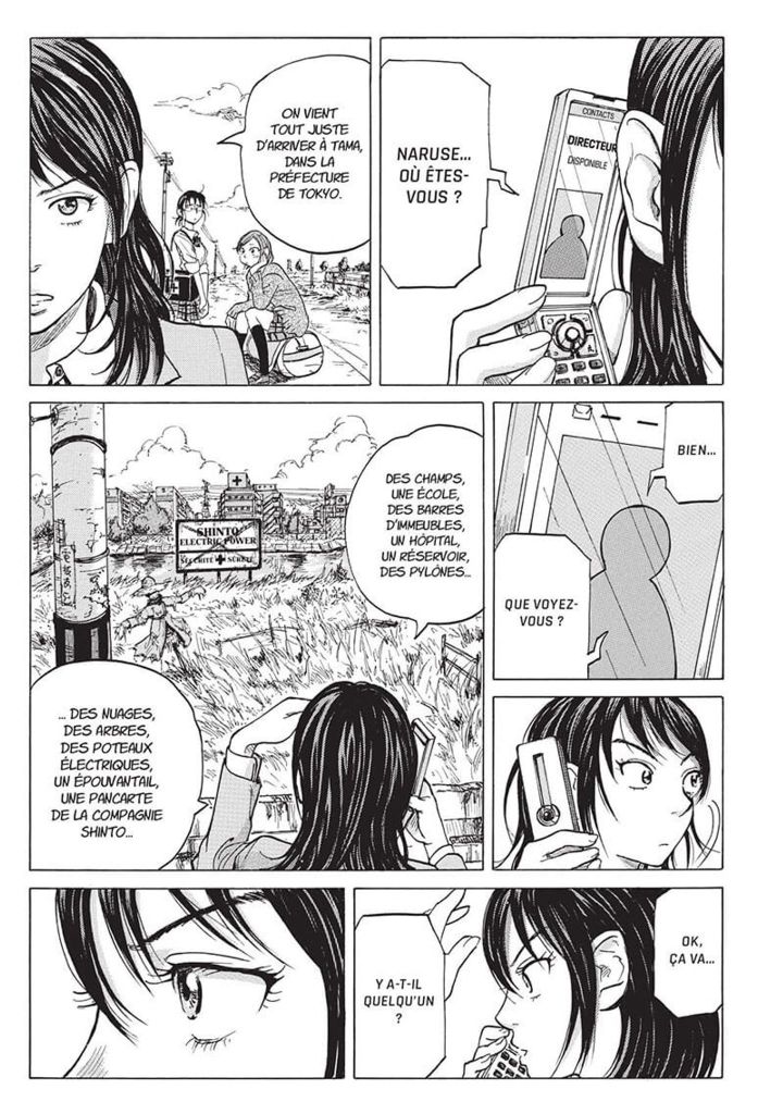 Quel plaisir de retrouver les trois petites adolescentes pleines de vie mener à bien leur mission. Elles sont des êtres particuliers car génétiquement modifiées. L’équipe peut aller tout affronter car elles résistent aussi bien au nucléaire qu’à des blessures simples. En plus, elles ont des pouvoirs spécifiques comme l’empathie pour les animaux et une bonne endurance. Les complémentarités les aident à être plus fortes et faire face à l’adversité. Tomonori Inoue se sert de ces personnages pour souligner la force surhumaine nécessaire pour faire face à l’horreur généré par un ensemble d’individus. « Construire des centrales nucléaires dans un pays avec une si forte activité sismique a toujours été une grosse erreur ». Cela souligne également que l’on n’apprend jamais de son passé. Qu’importe Fukushima, on a continué à faire des centrales malgré un danger possible. Mais peut-on demander à la population de vouloir moins d’énergie pour satisfaire des besoins de consommations toujours plus importantes? Le bonheur ne se fait-il pas avec des produits énergivores? Le mystère autour des livraisons est enfin résolu. C’est l’homme derrière la construction qui fait le nécessaire pour compenser son erreur. Il est facile de tout faire porter sur lui alors qu’il y a toute une chaîne de commandement impliquée. A nouveau, pour donner de la véracité à ce récit post-apocalyptique, le mangaka donne des explications techniques. « Il peut s’imprégner profondément dans le sol et contaminer toute une ville pendant plusieurs dizaines d’années… Il émet des rayonnements bêta et gamma et se dissout facilement dans l’eau. Le césium 137 est un radionucléide avec une demi-vie de 30 ans… C’est la pire substance radioactive existante. Les arbres régulent la teneur en eau de leurs feuilles grâce au potassium. Mais le césium 137 prend la place de celui-ci et s’introduit à l’intérieur de toute la plante. » La complexité du phénomène prend de plus en plus d’ampleur. Le taux de radiation n’arrête pas d’augmenter. Qu’est-ce qui peut se passer? Une nouvelle technologie avec un avion en forme de chauve-souris essaie de les abattre. Pourquoi? Que ce cache t’il derrière cette action assez radicale? L’accroche pour le troisième tome est des plus prometteuses : « A la poursuite du mystérieux appareil furtif, les trois Coppelion pénètrent dans la zone D… Le bassin de Tama cache un terrible secret… ! » Est-ce des industriels ont vu dans cet endroit une façon de gagner de l’argent autrement? N’y a t’il pas un autre risque sous-jacent?