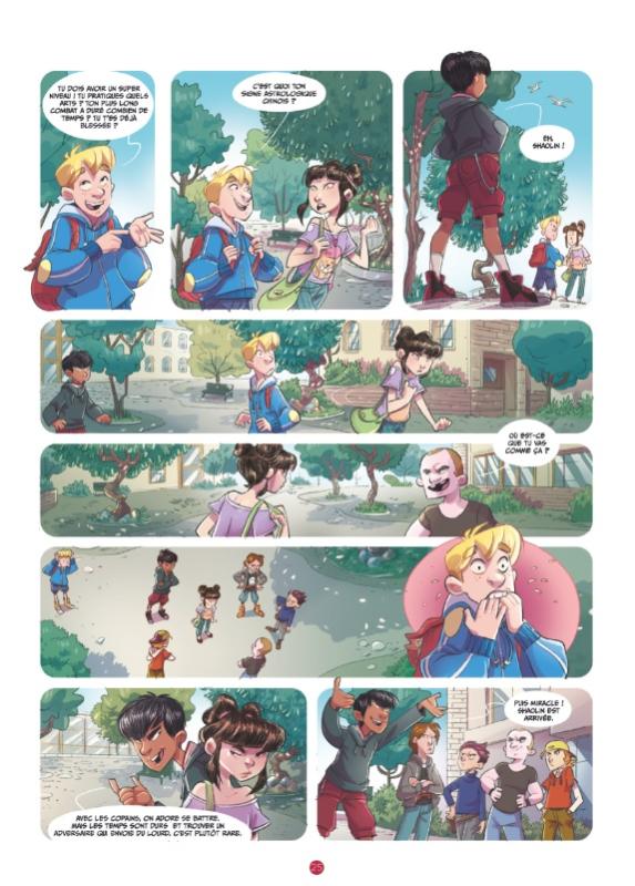 La collection Miss Jungle accueille une nouvelle héroïne. Les jeunes filles prennent de plus en plus confiance et on leur propose des adolescentes auxquelles s’identifier. La diversité devient plus présente à l’image de la société. Même si en effet, on peut se demander si Bo est si représentative et pas trop dans le clichée. Est-ce qu’une fille asiatique doit forcément avoir rapport avec les arts martiaux, être mince et très jolie? En plus, les références à « Karaté Kid » sont bien marqués et cités pour les néophytes. Les scènes de combats avec des apparitions d’animaux restent du même accabit. L’apprentissage des moines shaolin n’est pas forcément dans le sourire et la bonne humeur. Il serait plus dans la rigueur et la sévérité. Personne n’a dit qu’il fallait que cela soit un récit vraisemblable non plus. On voit une adolescente qui grâce aux arts martiaux a appris à être plus confiante et épanouie. Elle a des valeurs qu’elle aime partager. Isabelle Bottier et Cyril Kravtchenko mettent en trame de fond de leur scénario la discrimination, la violence scolaire et l’influence des réseaux sociaux. Un fait assez parlant pour les lecteurs. Licinia Tozzi propose un univers graphique dans la lignée du genre, assez classique, des formes arrondies, des couleurs vives et douce. Un trio très complémentaire mettant des valeurs positives au service de tous.