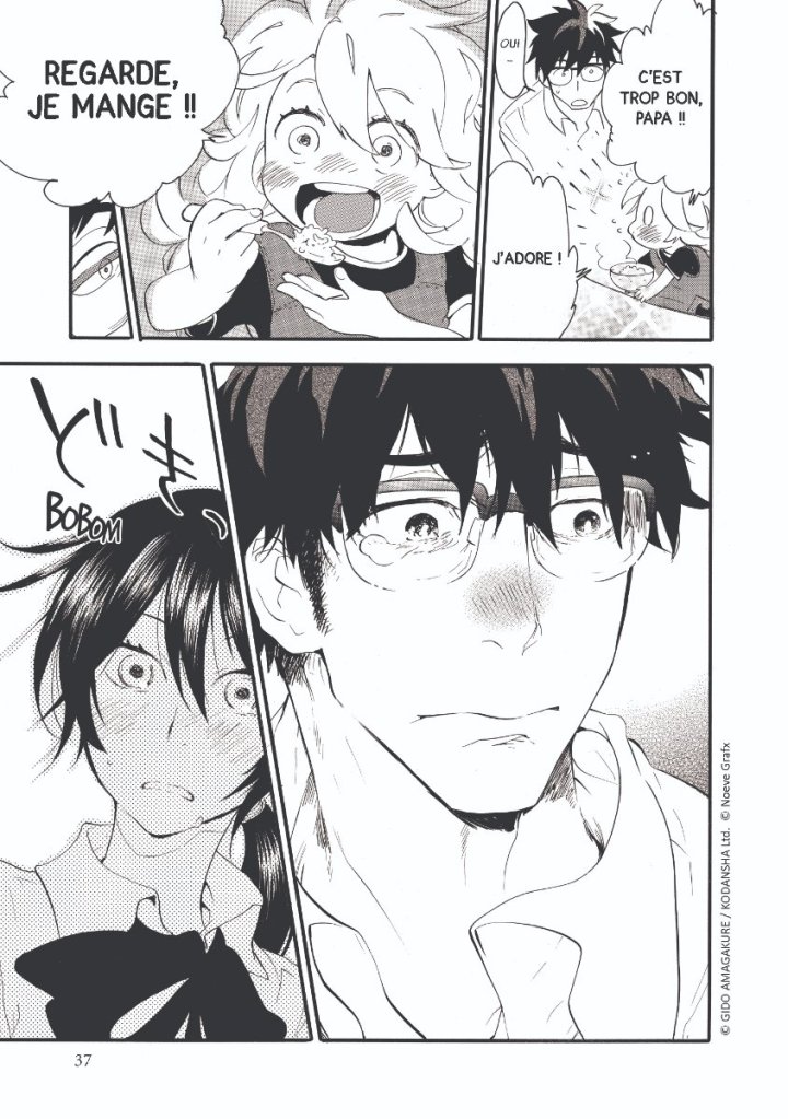 Les fans de mangas risquent d’être moyennement emballés car le schéma reste très classique. Un très gentil et très séduisant papa veuf, enseignant à l’école aime de tout son coeur sa petite fille. Une enfant très jolie, très sage, très curieuse et toujours enthousiaste. A cela se rajouter une adolescente qui se forme à la cuisine comme toute bonne futur épouse. Elle est jolie et attachante dans sa maladresse. Le tome se termine sur les émotions qui commencent à poindre à force d’être proche de son prof. Le thème principal reste la cuisine et le champ des possible qui s’ouvrent devant les néophytes. Si vous souhaitez reproduire les plats chez vous laissez tomber, ce n’est pas le but. Vous pourrez découvrir la richesse de la cuisine japonaise qui se montre très grande. Aucun problème à remplir les 12 prochains tomes. La suite sera consacré à la découverte des légumes pour les faire apprécier à la petite fille. Beaucoup de parents pourront facilement se reconnaître dans ce récit. Bien que le manga commence difficilement car se succèdent une suite de courtes saynètes sans vrai rapport entre elles. Après quelques pages, débutent enfin l’histoire qui se déroule sur plusieurs jours. On voit apparaître le fil conducteur. Il est dommage que l’on trouve du texte écrit en minuscule car c’est contraignant à lire. Et au final, on saute les passages car si c’était important, la taille de caractère aurait mieux été choisi. Bref, une lecture sympathique et sans prise de tête. Léger pour redonner le sourire puis l’oublier aussitôt.