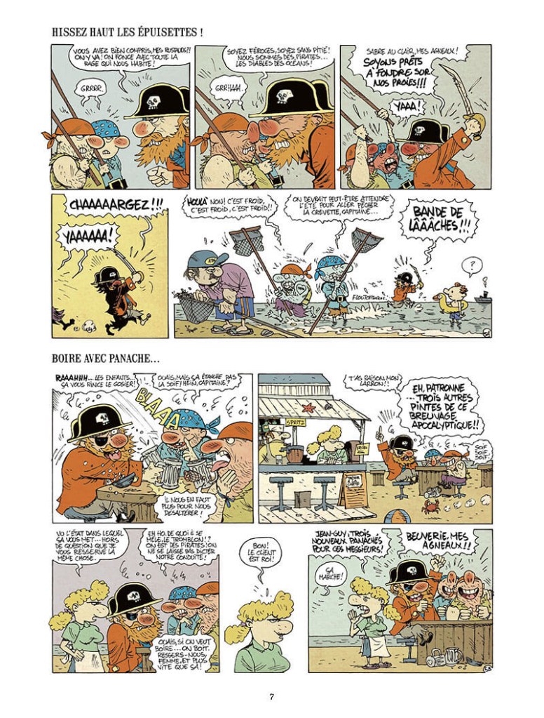 La vie de pirates n’est vraiment pas de tout repos. Il faut choisir les produits que l’on veut prendre. Il faut résister à la houle subit sur les bateaux. Il faut prendre sur soi quand on refuse le paiement en doublon. Et quand on ose leur manquer de respect, sans aucune peur ils sortent leurs épées et usent de leurs mots. La vengeance se fera grâce à un butin de guerre. Faire des conquêtes prend différentes formes. Avoir des bombes pour détruire l’ennemi n’est plus forcément adapté à notre époque. Une partie de pétanque reste assez similaire, on manipule des boules. Ces sauvages ont aussi un coeur tendre parfois. Quand il s’agit de protéger l’environnement, ils mettent la main à la pâte ou ils collaborent ensemble pour la prise d’une petite maison en plein air. Le lot de surprises est de taille quand ils découvrent le vrai sens du mot pirate 2.0. Voler de l’argent devient possible « et tout ça… sans bateau ». Mais leurs compétences hors du commun leur offre aussi des possibilités singulières de travail. Qui aurait cru que ces marins d’eau douce pouvait occuper des boulots exceptionnels? Pas eux en tout cas. Par chance, ils ont leur mémoire pour se rappeler les bons souvenirs de leur jeunesse.