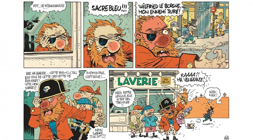 Tony Emeriau donne le ton dès la première page. On est ravie pour ces pirates d’avoir constitué un gros butin dans un caddie. Toutefois, ces malfrats déchantent assez rapidement quand la caissière leur annonce le montant à régler. Ce n’est pas facile de s’adapter au temps moderne. Les situations cocasses ne vont pas manquer avec cette rupture temporelle. Un esprit et une langue d’une autre époque doit faire face à la modernité contemporaine. Un choix assez ingénieux qui tranche avec les histoires de flibustier que l’on peut habituellement trouver. Le scénariste n’oublie pas de faire des gags sur leurs hobbies préférés comme la recherche au trésor. D’autant que c’est un genre qui connaît toujours son petit succès que cela soit à destination des adultes que des enfants. Tout est prétexte à faire rire simplement et directement tout à chacun. Cela demande beaucoup de travail car le message doit être simple et accessible à tous en juste 5/6 cases. D’ailleurs, on va trouver des référence à la protection de l’environnement, l’analphabétisation, l’importance du numérique… Dominique Hennebaut joue également avec les codes dans la représentation des forbans. Le capitaine est roux avec un bandeau sur oeil, peu de dents, une veste rouge et un chapeau noir en compagnie de deux sous-fifre avec un chiffon sur la tête, gros nez et barbe apparente. Le dessinateur ose s’amuser avec son trait appuyer et ces couleurs en aplat. Les deux artistes se sont trouvés pour créer un ouvrage qui se partage toutes générations confondues.