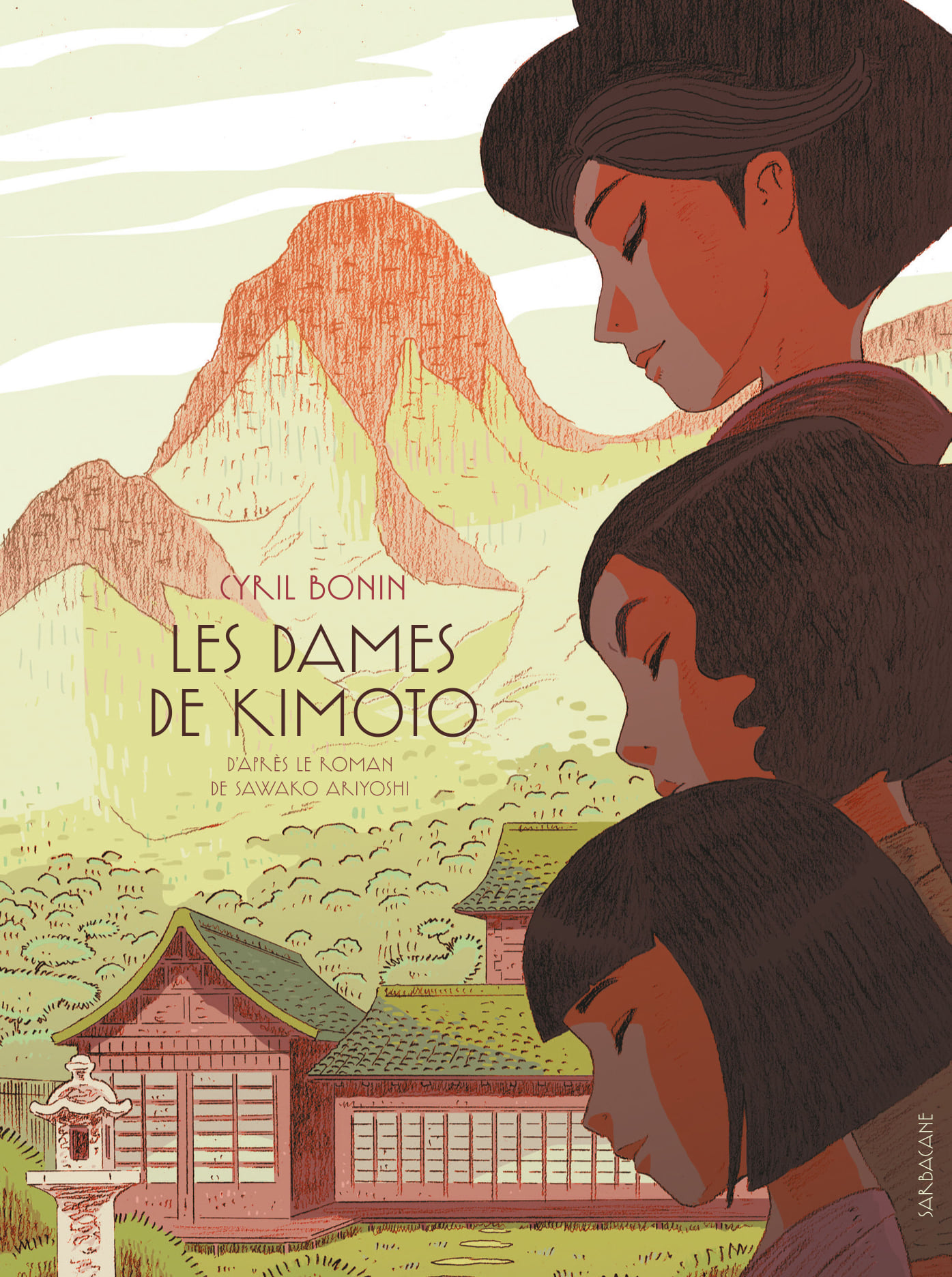 Pour sa nouvelle bande dessinée, Cyril Bonin décide d’adapter le roman « Les dames de Kimoto » de Sawako Ariyoshi sorti en 1959. Un défi audacieux où les passionnés de littérature sont impatients et sans pitié. Quand on aime un roman, on veut retrouver cette ambiance particulière à travers des images. Par chance, je ne connais pas l’oeuvre originale et donc je ne pourrai me permettre aucun comparatif. Mais le créatif a décidé de retranscrire le rapport à la tradition et à la culture à travers trois générations de filles d’une même famille. On le découvre en regardant attentivement la couverture où l’on observe trois femmes très différentes. Chacune est vue de profil avec les yeux fermés et le visages inclinés, comme un signe de soumission. En haut, on voit Hana qui représente la tradition. On le sait d’un regard avec une coiffure traditionnelle, un léger maquillage et le haut d’un kimono. La seconde, sa fille, Fumio, avec une coiffure plus moderne avec des cheveux libres et travaillés. Et enfin, Hanako, la petite fille avec une coupe classique pour les enfants. On voit progressivement l’ordre social doucement évolué. La relation entre mère, fille et petite-fille n’est pas un long fleuve tranquille. L’homme reste au coeur de la famille. Avant les femmes étaient des objets de trocs pour les statuts sociaux. Avec le temps, c’est devenu un peu moins vrai. Bien que les hommes soient toujours privilégiés, le scénariste montre qu’au sein d’une même famille avec plusieurs garçons cela pose problème. Et si l’un a un handicap, cela est aussi problématique. La pression liée au paraître, l’importance d’une lignée, la visibilité intérieure et extérieure de signes de richesse est omniprésente. Peuvent-ils juste penser simplement à ce qu’ils veulent? La femme qui était juste un objet et une machine à bébé commencent à pouvoir rêver autre chose. L’université s’ouvre à elle et elle peut travailler. Toutefois, on va exiger dorénavant qu’elle travaille, qu’elle rapport de l’argent tout en gérant la maison, la cuisine et faire des enfants. Le poids des traditions ne part jamais. Bien qu’instruit, on va toujours au temple, on fait des dons en argent… Si un malheur arrive c’est à cause d’un non respect d’une ancienne pratique. Quoi d’autres? Une façon aussi d’inculquer la culpabilité. Un frein à l’épanouissement qui rajoute des contraintes à celle déjà présentes au quotidien. On se laisse porter surtout qu’en trame de fond se déroule des grands évènements comme la montée des populistes, les bombes incendiaires et les bombes nucléaires.