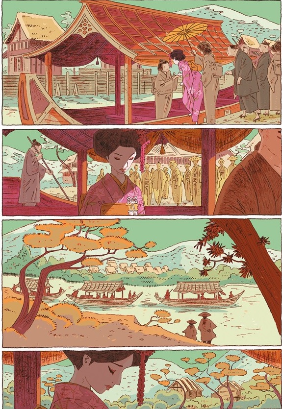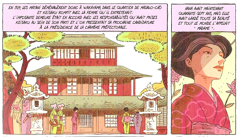 Au niveau graphisme, on prend son temps pour admirer les pages. On nous immerge dans le Japon ancestral avec des temples, des châteaux, des arbres en fleur, des kimonos élégants, des coiffes très soignées… D’ailleurs, dorénavant ces paysages et ces tenues sont bien souvent encore présents. L’évolution des moeurs se voient à travers des vêtements plus pratiques et confortables tout comme le maquillage et les coiffures. Les visages sont centraux et traduisent une foultitude d’émotions. Les regards deviennent plus francs et droits pour les femmes. Elles ont leur mot à dire même s’il reste avec moins de valeur. Les couleurs apportent beaucoup de quiétude, d’apaisement et de douceur. Le rose souligne l’élégance des femmes et aussi cela de la nature. Un ouvrage ingénieusement réalisé qui donne envie de lire l’œuvre d’inspiration et de découvrir le pays du soleil levant.