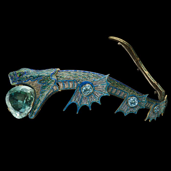 On s’interroge sur un bijou de tête car on se demande comment on peut le mettre. Une charmante médiatrice vient à notre rencontre pour nous expliquer le fonctionnement. Sous les nageoires se cachent des systèmes qui permettent la mobilité. Ainsi il peut devenir bijou de tête ou collier. Mais est-ce que quelqu’un a vraiment porté cet étrange bijou? Nous ne le savons pas et il n’y a aucune photo.