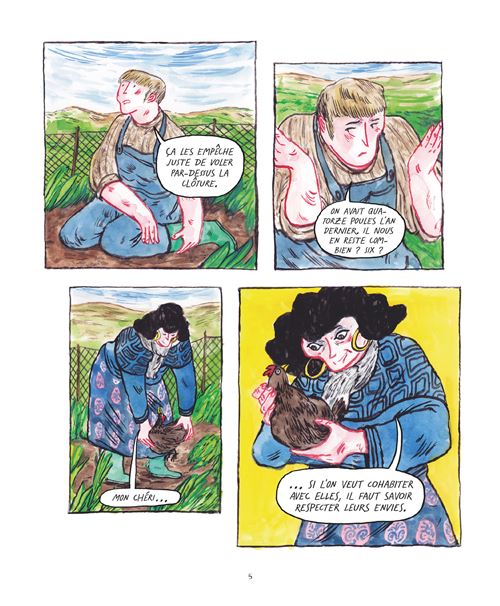 Quand on lit le titre de la bande dessinée « Recette de famille », on peut s’attendre à trouver des préparations secrètes de famille. Et bien, pas du tout, nous en sommes d’ailleurs très loin. Toutefois, la filiation est bien présente mais pas comme vous pourriez l’imaginer. Qui ne rêverait pas de quitter la maison dans laquelle on a grandit, surtout complètement isolé sur une île? C’est un bon terreau pour débuter une histoire surtout entre frangins. Rowan et Tulip sont différents et pourtant très complémentaires. Ne pourrait-il pas émerger des conflits entre eux? L’un aime le rapport à la terre et des rapports simples avec ces amis. L’autre aime l’argent et la popularité. Forcément à un moment ça dérape. N’oublions pas que James Albon est anglais et qu’ils sont des adeptes de l’humour noir. C’est ce ton assez singulier et absurde qui permet à Agatha Raisin de M. C. Beaton d’avoir tant de succès. C’est la terre des Monty Python et même de Mister Bean, même si l’on n’est pas sur le même registre d’humour. Par conséquent, on nous sert sur un plateau une récit bien sombre et amusant avec une grosse quantité de cadavres. Certains sont d’ailleurs très utiles puisqu’ils permettent de faire pousser un succulent champignon. Les ambitions des uns affrontent l’éthique des autres et cela ne peut que mal tourner. Le lecteur aimera être étonné par les retournements de situations plus grotesques et improbables les uns des autres. Par contre au niveau graphisme, la surprise est au rendez-vous. Ceux qui aiment le classicisme auront mal à la rétine. C’est très coloré, pas forcément réaliste, le trait de crayon très présent et sans contour noir. Ce choix confère beaucoup de dynamisme et de joie à la bd qui au final ne l’est pas tant que ça.