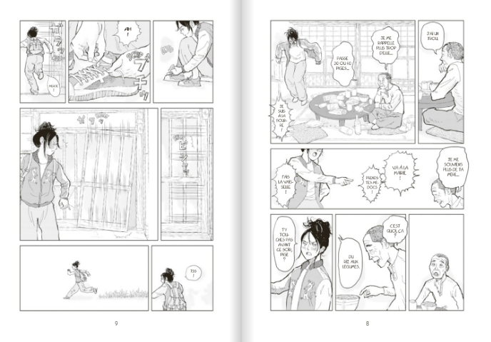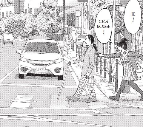 Quand deux opposés se rencontrent cela donnent une histoire à raconter. Akira Saso parle de la rencontre Chihaya, une demoiselle voyante qui est totalement fermée à son entourage et toujours mécontente. Et de l’autre côté, Ichitarô, aveugle, un homme qui garde toujours le sourire et culture son optimisme. Forcément, les deux être vont apprendre à se connaître et se découvrir. Le mangaka prend le temps de raconter les choses. Tout est lent ce qui ne veut pas dire qu’il ne se passe rien. On agit de façon différente quand on voit que lorsqu’on ne voit pas. Le passé incite à penser nos relations aux autres différemment. Quand on s’ouvre même à des inconnus, il se passe toujours des choses, même les plus improbables. C’est rempli de bons sentiments. Pourtant, il manque un zeste de vraisemblance ou d’un quelque chose qui nous donnerait envie de nous accrocher aux personnages. On nous présente la difficulté de la ville pour les mal-voyants aussi bien dans l’accessibilité que dans le comportement inapproprié de certains locaux. Une forme d’ennui s’installe. Pourtant il va y avoir les accidents d’Ichitarô, l’alcoolisme du père de Chihaya, la fermeture du restaurant au bord de l’eau, la visite de l’école pour les aveugles… Est-ce qu’il n’est pas nécessaire aussi d’apprécier cette sensation d’ennui? Doit-on s’ennuyer en lisant? A moins que cela soit le dessin assez imprécis, brouillon qui nuit au plaisir. A force de lire des séries comme celles de Naoki Urasawa, on s’habitue à un travail précis et minutieux. Est-ce une façon de montrer à travers un autre graphisme, une autre façon de percevoir le monde, plus réaliste? En tout cas, l’ouvrage se referme avec une pointe de déception et surtout l’envie de ne pas lire d’autres mangas de l’auteur.
