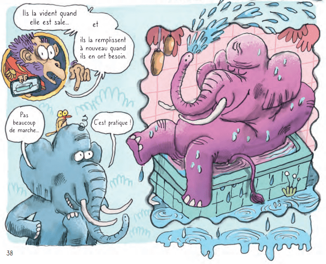 A l’évocation du titre « Elvira & Otto dans la jungle » et quand on jette un coup d’oeil aux dessins, cela nous évoque bien d’autres bande dessinée. Tout d’abord le monde un peu de « La Jungle en folie ». Une série animalière culte créée en 1969 par le scénariste Christian Godard et le dessinateur Mic Delinx. Puis pour les puristes le fameux « Le Concombre masqué » créée en 1965 par Nikita Mandryka sans omettre Mordillo, bien entendu. Un grain de folie douce touchait ces ouvrages d’un autre temps que les jeunes ne peuvent pas connaître. Peut-être que de tels lectures ont bercé un moment la jeunesse de Martin Baltscheit et Max Fiedler car on retrouve ce côté loufoque et absurde dans leur création. Très vite, ils trouvent le moyen d’emporter le lecteur rapidement et efficacement. Tout commence avec une scène pas si innocente car on peut toujours se faire manger par plus fort que soi. Au final, le bouzier, extraordinaire animal au demeurant, en sort vainqueur. Un petit aparté amusant à l’image de l’ensemble du récit. Qui pourrait croire que dans la nature une antilope pourrait sortir avec un éléphant? Ne dit-on pas qui se ressemble s’assemble. L’amour n’est-il pas plus fort que tout? N’est-il pas là aussi pour inciter les autres à se poser des questions pour être plus bienveillant avec leurs congénères? On rit, on réfléchit, on apprend à se demander c’est quoi la normalité au final. La consommation rend-elle la vie plus jolie? Pourquoi se passer d’un tel petit bijou d’humour? Les enfants vont adorer et les adultes aussi. La suite promet de sacrés rebondissements.