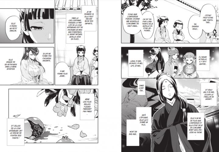 Les talents de Mao Mao sont encore sollicités. Le très charmant eunuque à l’aspect androgyne lui demande de mener une enquête en conséquence au décès d’une servante dans la cour intérieure. Ce qu’elle découvre n’est pas très réjouissant. Il faut qu’elle agisse pour le bien de tous en respectant les convenances liées au lieu et à sa position sociale. Une personne doit payer tout de même pour ce qui est arrivé. Derrière ça, toute les personnes liées de prêt ou de loin doivent être chassées. Mao Mao fait parti de ce groupe. Contrainte et forcée, elle retourne dans le quartier des plaisirs et bientôt, on va lui demander de faire usage de son corps. Sa dette n’a pas pu être remboursée. Jinshi joue toujours un rôle important et va lui proposer un nouveau rôle au sein de la cour. Que va t’on exiger d’elle? Nous le serons dans les prochains tomes. Déjà, on a assister à une enquête policière dans un milieu de femmes très compétitif et sans pitié. Pour garder des privilèges, tout est possible même le meurtre ou l’empoisonnement. Le suspens est présent à chaque page et cela nous incite à aller plus loin. Impossible de ne pas s’attacher à cette héroïne aussi charmante et sensible. Elle veut toujours bien faire pour chaque femme. Aucune n’a vraiment une position enviable contrairement aux hommes. Le personnage de Jinshi est très intriguant. Pourquoi veut-il garder prêt de lui la demoiselle? Qu’a t’elle de particulier? Pourquoi déprime t’il en son absence? Surtout qu’aucun jeu affectif ne peut se faire. Aucun doute que nous aurons quelques indices pour la suite.