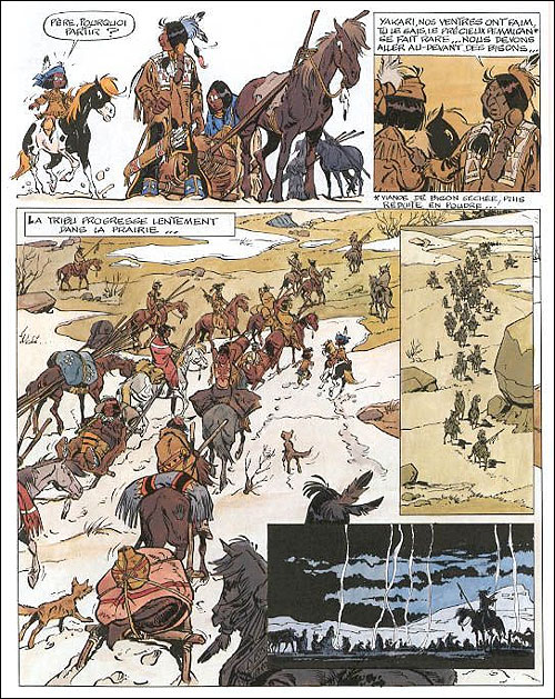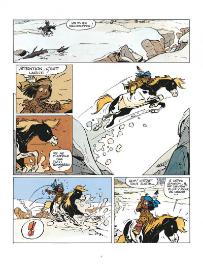 Bien que ce deuxième tome de la série soit sorti en 1976, il garde une fraîcheur innocente qui ne vieillit pas. Les sioux vivent au rythme des saisons et cette année l’hiver tarde à laisser place au printemps. Les choses viennent à changer et cela demande de s’adapter. Bien entendu, l’ère industrielle n’étant pas déjà passée, on ne peut pas parler de changement climatique. Le peuple autochtone fait de son mieux pour la survivance des leurs. Yakari très connecté à la nature et à ces esprits, il va changer la donne. Le Grand Aigle lui indique en rêve où il faut aller pour ramener les bisons. Après une longue marche dans le désert, il découvre l’oasis où le troupeau se repose. Le lecteur va assister alors à un échange surprenant entre le chef du troupeau, le bison blanc et l’enfant. Il lui dit en tout innocence : « Ma tribu a faim, bison blanc! […] Et où trouverons-nous à manger si ton troupeau reste caché ici? ». L’animal répond calmement : « Les hommes ont besoin de nous, nous devons aller à leur rencontre… Les plus faibles d’entre nous mourront, mais je sais que les vrais chasseurs ne tuent jamais plus de bêtes que leur tribu n’en a besoin ». Le chef sait qu’il a un rôle à jouer et qu’il est au service de l’Homme. Les plus faibles serviront de repas aux gentils sioux qui ne prélèvent que ce qu’ils ont besoin. Une forme d’équilibre sera ainsi respecté. Est-ce une façon élégante de dire aussi que dorénavant on produit plus que nécessaire et que gâcher des animaux n’a pas d’importance? Une problématique qui a déjà émergé dans les années 80. Une lecture agréable et facile à s’approprier. Idéal pour les premières lectures pour les petits qui peuvent s’accompagner de discussion avec les adultes. Maintenant les bambins découvrent les animaux dans des salons, des fermes pédagogiques et ils ignorent qu’avant des animaux de consommation vivaient dans la nature, même si ce ne sont plus les mêmes. Derib et Job soulignent également l’importance du cheval pour pouvoir rester nomade et indépendant alimentairement. L’animal est toujours présent dans la série comme son homologue Jolly Jumper. Il parle et possède son nom, Petit Tonnerre. Contrairement aux autres équidés, il est libre. Sur son dos, il n’a pas de selle et pas de mors. Il reste par amitié pour son cavalier.