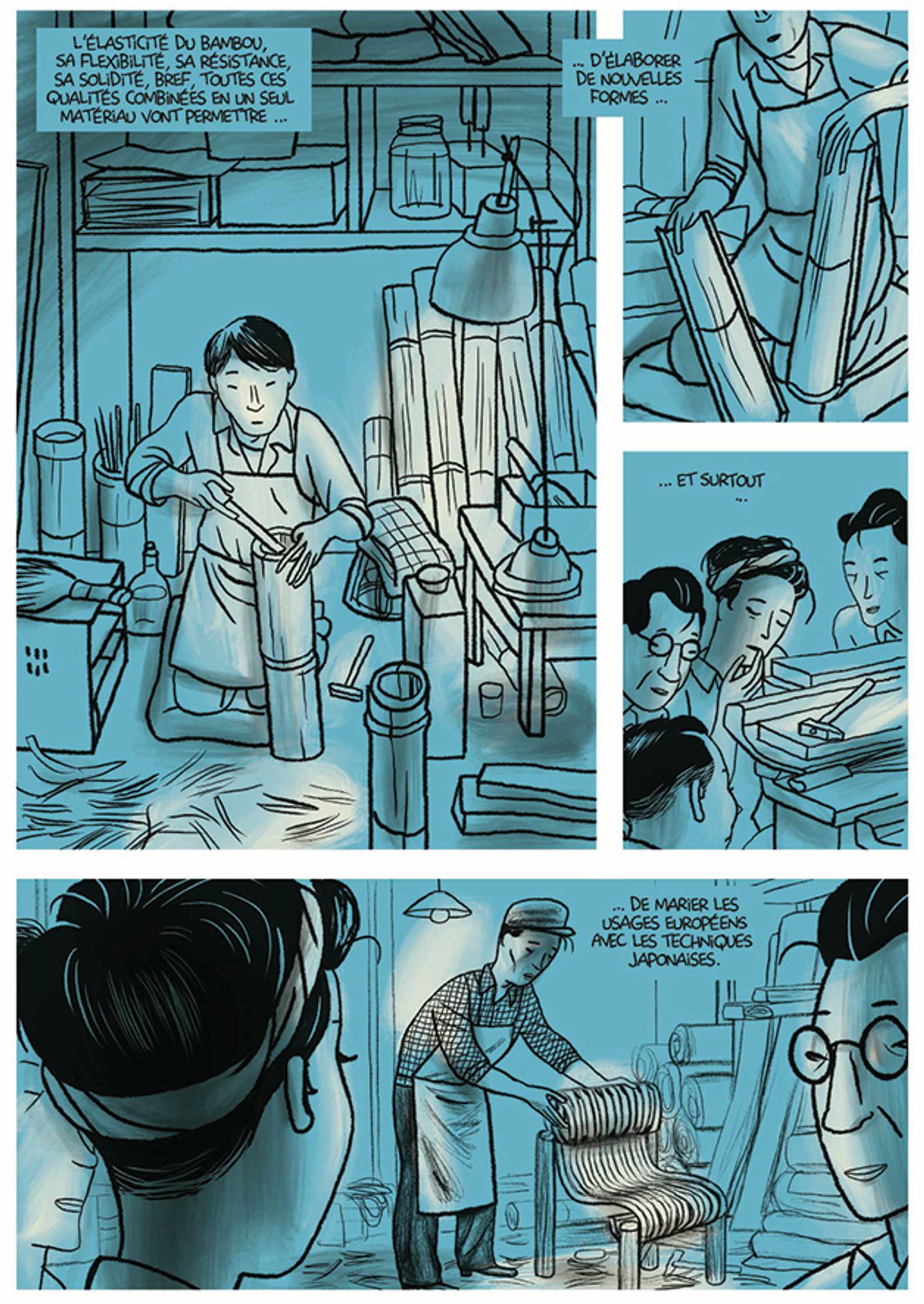Charles Berberian ne pouvait rendre plus bel hommage à Charlotte Perriand. On sent l’admiration du créatif pour une autre. Il a décidé d’évoquer une courte période qui commence en 1940 où elle va au Japon à la demande du gouvernement français. Elle a une vision très particulière du mobilier d’intérieur. Elle le pense autrement, plus pratique, avec des nouveaux matériaux. Le pays du soleil levant est vraiment un royaume de la découverte et qui va à l’essentiel. Les intérieurs sont vides et vont à l’essentiel. Quel révolution pour elle. Même en étant une femme dans une société d’hommes, elle a su s’affirmer et se faire entendre. Son authenticité et sa générosité ont toujours été des capacités appréciées de tous. Charles Berberian y met beauté et de sincérité grâce à ces aquarelles et ces personnages marqués au trait noir. L’autre moitié de l’album est un échange entre le dessinateur et Pernette Perriaud, la fille de Charlotte. Un échange passionnant qui montre l’amour sincère pour le travail de cette architecte hors du commun. Heureusement qu’elle a écrit une partie de sa biographie pour donner à voir ses productions autrement. Une façon élégante de présenter une artiste hors du commun que tout à chacun devrait connaître. La renommée du Corbusier est aussi lié à la sienne car elle avait un talent qu’il n’avait pas. Un ouvrage qui devrait passionné les fans pour découvrir une autre facette d’une femme hors du commun.