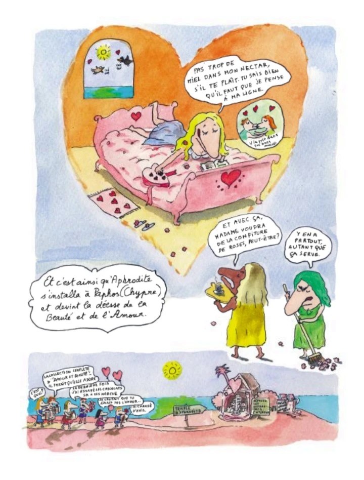 Parmi les habitants de l’Olympe, un d’entre eux tire son épingle du jeu. La déesse de la beauté et de l’Amour va dévoiler les dessous de leur vie quotidienne qui ne manque jamais de piquant. Attention âmes sensibles car nous allons être plongé au cœur des fourberies et des adultères. Aphrodite est très convoitée et elle adore ça. Pourrait-il en être autrement? Déjà, elle s’ennuyait au milieu de la mer donc il lui reste à trouver un endroit où habiter. Elle s’invite à Pathos à Chypre auprès des saisons. L’hospitalité, c’est fait pour en abuser apparemment. Très vite, elle a un enfant, un petit gars simplement appelé Eros, dieu de l’Amour. D’une flèche, il pousse deux individus à s’aimer. Lui est malheureux car il ne connaît pas ce sentiment. Pour passer le temps, il expérimente encore et encore. De toute façon, sa mère a autre chose à faire car dans « Olympe news » elle lit : « Psyché! Plus belle que la plus belle des déesses!!! ». Pour la peine, sa vengeance sera terrible. Sauf si l’on doit compter sur le hasard qui donne un coup de cœur à ce brave Eros. Ce n’est que le début des ennuis où jalousie, tromperie, violence vont s’entremêler sans jamais s’essouffler.