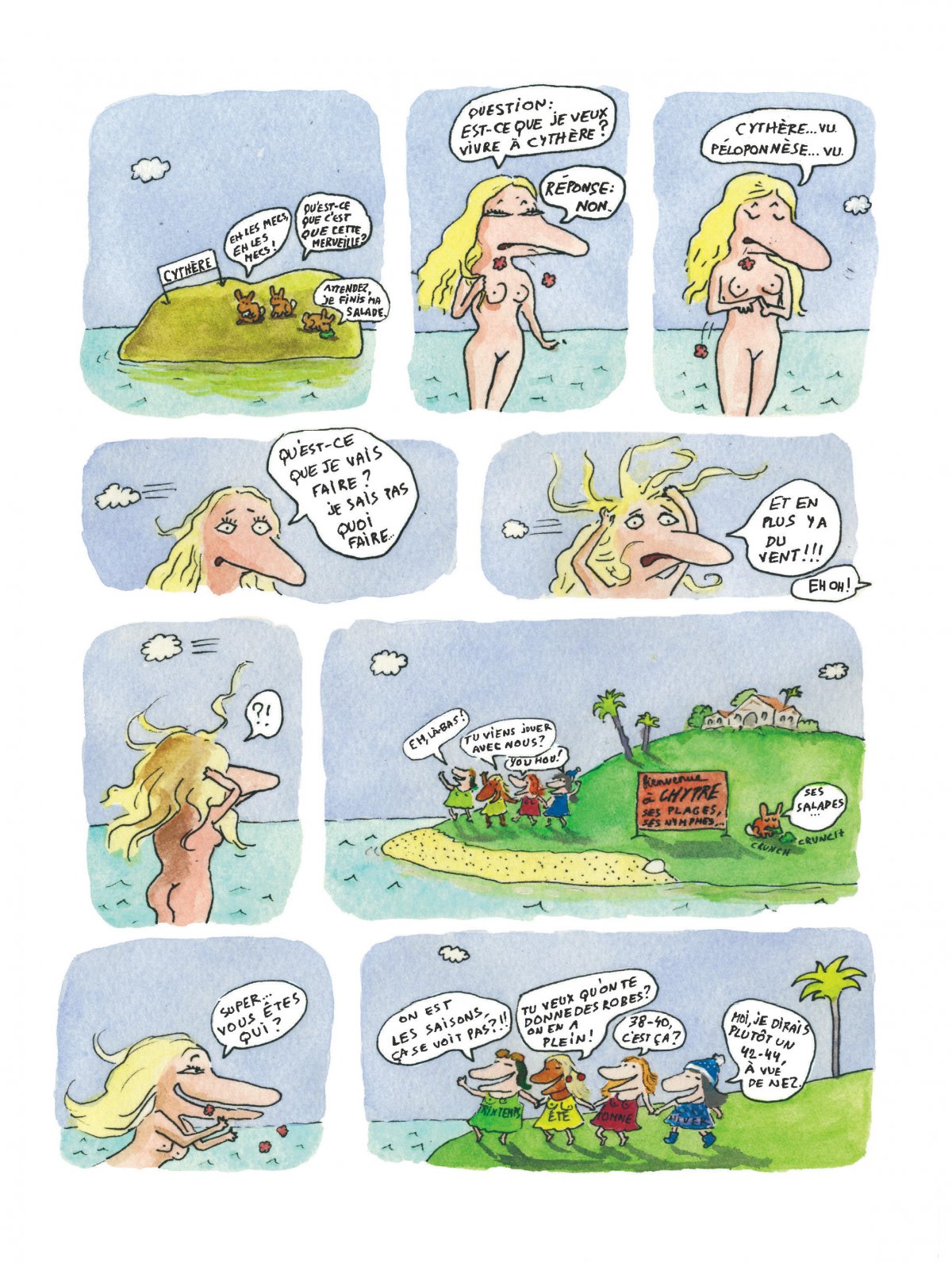 Nadja Fejtö est un nom assez réputé dans la littérature jeunesse. Elle a reçu un prix Totem du Salon du livre de jeunesse de Montreuil pour « Chien bleu » avec son magnifique travail à la gouache aux touches fauves. Les éditions Dupuis font appel à elle pour inaugurer leur collection « Les Ondines ». Un choix significatif pour commencer avec un style graphique très singulier. D’ailleurs, il suffit de regarder la couverture pour savoir à quoi l’on va s’attendre. Aphrodite possède un corps de femme avec un visage où la bouche ressemble à une gueule de crocodile. Nous sommes très loin de la représentation de Cabanel. Cela peut paraître normal puisque nous avons des clins d’œil à la culture moderne. Elle donne des interviews, lit le journal, parle face à la caméra… Il manque presque que les réseaux sociaux pour l’encrer dans notre réalité. Le jeune lecteur arrivera très bien à faire le parallèle. Toutefois, on risque d’être un peu exaspéré par ces femmes toujours dans la séduction, la rivalité, la malhonnêteté, la manipulation. Aphrodite représente vraiment le culte du narcissisme et de l’égocentrisme ce qui tape sur le système au bout d’un moment. En effet, cela n’a rien à envier à une certaine télévision voyeuriste avec des échanges dignes d’une fiction écrite par des adolescents sous drogue. Néanmoins, l’auteure n’oublie pas de mettre des vraies références tout de même comme Héphaïstos, fils d’Héra et de Zeus, l’arrivée de Perséphone aux Enfers. Est-ce que cela suffira à convaincre les néophytes que la mythologie est passionnante?