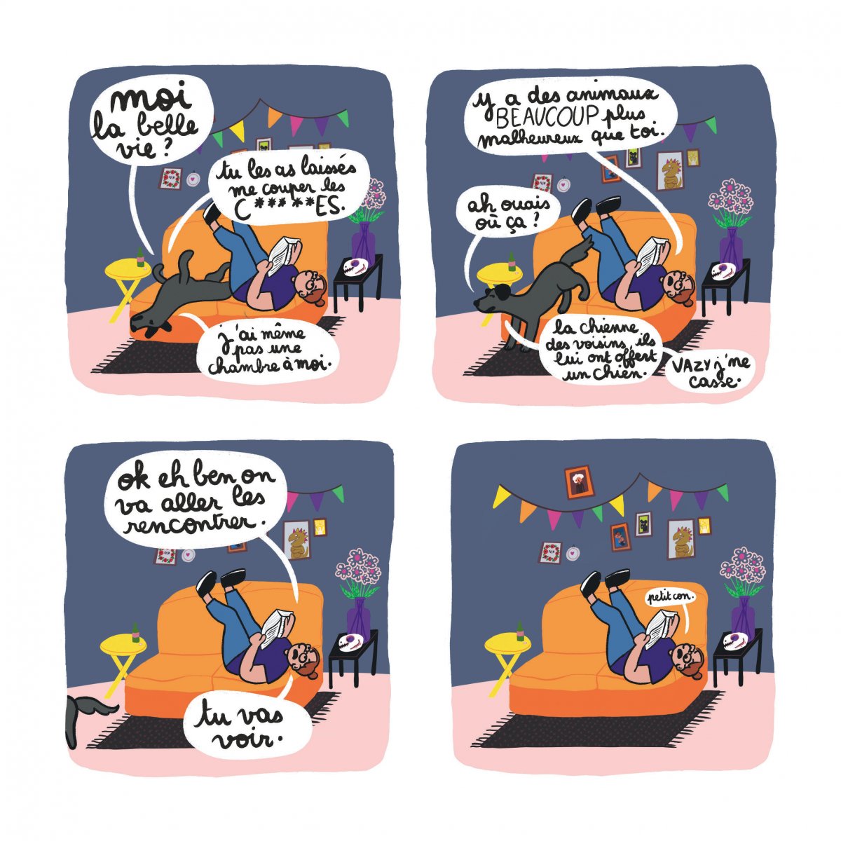 Une certitude, on ne lit pas cette bande dessinée par hasard. Tout est indiqué sur la couverture, aussi bien le titre que de nombreux animaux. La violence animal a toujours existé. Est-ce que cela suffit à l’expliquer? Maintenant nous possédons une source de connaissance assez importante, ne faut-il pas alors changer son fusil d’épaule? Sandrine Deloffre en est persuadée et elle le prouve dans son ouvrage. Pré-publié sur Instagram sur le compte « Mâtin! », collection bd chez Dargaud, dorénavant les petites histoires sont regroupées dans un seul livre avec en bonus des informations complémentaires et des chiffres. Sur les dernières pages, on à un panel de source pour vérifier les données. Elle aurait pu choisir un angle culpabilisant en disant que tout le monde est complice de ce jeu. Mais elle préfère prendre un ton plutôt humoristique. Un choix très judicieux plus percutant pour qu’il puisse être lu et faire un cheminement dans la réflexion. Elle ose tout sans craindre des critiques en abordant la chasse, la consommation de lait ou les animaux du cirque. L’approche culturelle est indéniable sans omettre l’aspect économique et politique non négligeable. L’écologie c’est bien tant que cela n’influence pas le monde de l’argent. La créatrice pose le consommateur comme un influenceur non-négligeable. Maintenant c’est à vous de répondre, les animaux vous les aimez comment?