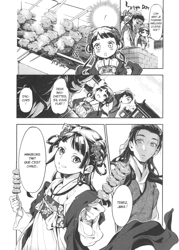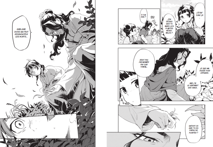 Son nouveau statut lui permet d’avoir un peu plus de liberté pour sortir. D’ailleurs, elle en profitera pour voir son père. Mao Mao va en dévoiler plus sur lui à Jinshi comme le fait qu’il est devenu un eunuque. N’est-ce pas nécessaire quand on travaille dans le quartier des plaisir? Pourtant cela l’interroge. Etes-ce vraiment nécessaire? Une porte sur le passé de l’héroïne et de sa famille s’ouvre un peu et nous aurons plus d’informations là-dessus par la suite. Itsuki Nanao poursuit sa connaissance grâce à sa grande perspicacité ce qui l’amène à sauver la vie de justesse à son protecteur. Derrière tout ça se cache apparemment deux individus qui avaient été introduits précédemment. Qui est vraiment cette femme d’une grande beauté ayant des savoirs autour des plantes? Et surtout qui est cet homme à l’air cruel voulant impérativement Mao Mao à ces côtés? Là encore, nous en saurons plus une fois prochaine. En tout cas, il joue un rôle assez important qui nous sera dévoilé progressivement. Forcément, il y a un fil rouge reliant chaque élément. On s’attache toujours à cette petite équipe où chacun joue son rôle en restant à sa place. Mais les apparences sociales sont-elles si importantes? sont-elles pas juste une illusion? Les pages se tournent avec beaucoup de curiosité. D’autant plus, que le tome se termine sur un cliffhanger des plus perturbants. Une cérémonie a été déranger, une vie sauvée et une autre qui est gravement blessée tout cela va mener à des bouleversements. Quelles conséquences cela va t’il avoir? Il faut patienter car les réponses ne viendront pas prochainement. La mangaka évoque aussi le triste sort des concubines quand elle tombe malade ou deviennent trop âgées. Que valent-elles si on ne les désire plus? Malgré tout ça, on trouve toujours une touche d’humour pour détendre l’atmosphère. On apprécie particulièrement le moment où Jinshi est transformé en homme du peuple. Difficile de le transformer tellement il est beau et parfait physiquement. Et comment ne pas rire quand il est transformé en femme grâce à du rouge à lèvres.