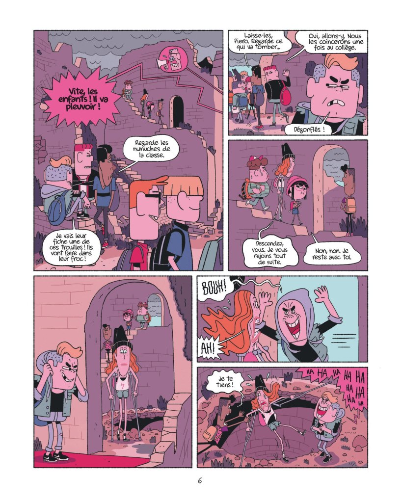 Dès les premières pages, nous sommes immergés dans l’aventure de cette bande d’ados. Une sortie scolaire n’est pas toujours une partie de plaisir. Surtout quand il va pleuvoir et que la visite manque d’intérêt. Le crâneur débile pousse une demoiselle en béquille dans un trou ce qui engendre une catastrophe. Après on connaît la citation, qui fait le malin tombe dans le ravin. Ainsi tous ensemble font face à ce monde étrange et hostile. Par chance, des individus vont les aider. On s’amuse à les suivre dans l’improbable. L’amitié et la solidarité permettent d’affronter tout ce qui se présente. Même la tête de cochon qui est principalement jaloux va s’adjoindre à la fine équipe. Etre seul n’est jamais facile. Le harceleur change d’attitude car au final il n’y a rien de fier dans ce qu’il a fait. Un message assez positif destiné au public jeunesse. Il devrait se reconnaître dans plusieurs personnages. Niveau graphique, nous sommes pas dans un univers pas très classique. Les corps sont très géométriques sans pour autant aller dans l’univers de Minecraft non plus. Les couleurs dynamiques et chaleureuses contribuent à apporter beaucoup de mystère et de réconfort. La fin est très bien amenée qui incite à lire la suite. Que vont-ils devoir affronter dans le monde des dinosaures?