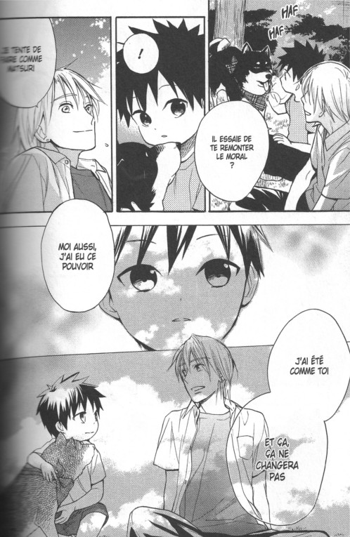 Ce tome clôture la série. On pouvait se demander qu’est-ce qui pouvait être raconté pour les scènes finales. Il ne se passe pas grand chose d’extraordinaire. Pour donner suite à la précédente aventure, Kôji a perdu son don. Malgré la peur, il doit le dire à Daichi qu’importe les conséquences. Le petit garçon s’enfuit quand il entend la vérité. Un sentiment de solitude l’affecte. Peu de temps après c’est son anniversaire. Le matin au réveil lui aussi a perdu son don. Le voilà comme tout le monde avec son lot de copains qui ont tous les âges. Yoko Fujitani a choisi le plus facile et le plus mignon. On pourrait se dire aussi tout ça pour ça. Il a manqué de magie, de fantaisie et de merveilleux. Quand on entend ce que peut dire les objets, les vêtements et les individus on s’attend à beaucoup de chose. On là on avait plus le droit à joue avec moi pour un ballon ou décroche d’un téléphone. Un potentiel important qui n’est pas compensé par un enfant et un adolescent en doute. Il n’y a pas d’âge pour avoir peur de dire ce que l’on ressent et ce que l’on pense. Bien entendu, on voit différentes versions d’un couple. Des parents assez distants, des parents très proches et aimants et les premiers pas d’un couple en devenir. Mais des couples à deux et hétéros ce qui est aussi très limitatif et cliché, même pour une fiction japonaise. Tout plein de mignon qui fleurte bon avec les clichés. Pourquoi vouloir faire des choix complexes quand en faisant simple on a la garantie du lectorat? Au moins, cela permis de changer un peu les idées avec un genre que je lis peu.