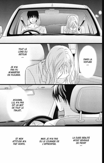 Rie Aruga continue à faire monter la pression pour nous parler d’un couple singulier. Ayukawa pense qu’être en fauteuil roulant est un frein pour pouvoir vivre en couple, surtout avec quelqu’un qui marche. Le problème vient du fauteuil mais surtout des soins qu’il faut lui prodiguer. Le fait de ne pouvoir marcher engendre des dysfonctionnements. S’occuper de lui est une charge dont il ne souhaite à personne de la porter. Et s’il se trompait de point de vue? Si le plus gros problème est sa vision du monde plus que son handicap? Une illumination qui est venu d’un architecte qui pense l’habitat pour une vie harmonieuse qu’importe ces problèmes de marche ou pas. La mangaka apporte un point de vue extérieur avec un argument d’autorité. Elle rajoute à cela la déclaration d’amour de son infirmière. Elle l’a toujours aimé. Le carré amoureux est maintenant bien posé. Tsugumi blessée dans son orgueil accepte les avances de Koré-éda. Les retournements de situations vont se poursuivre non-stop. Pour ajouter un côté un peu tragique, l’héroïne quitte son boulot et Tokyo pour rester aux côtés de son père mourant. Il voudrait la voir marier rapidement. Qu’importe si elle a une relation affective épanouissante. Les apparences sont plus importantes que tout. Et surtout il faut qu’elle se marie avec un valide sinon que vont penser les autres. L’honneur de la famille risque d’en prendre un coup. Vive la pression sociale. D’ailleurs, le couple marié dont le mari est en fauteuil souligne encore que la famille et les amis auraient préférés qu’ils divorcent. C’est tellement cruel et injuste cette mentalité médiocre. Au niveau du rythme, j’ai trouvé que c’était un peu décousu. Au niveau de la structure du scénario cela s’étend beaucoup sur le bureau des pleurs encore et encore. On s’attend presque à voir arriver Caliméro. Même si on sait comment tout cela va se terminer la curiosité reste pour assister aux bouleversements donnant le déclic d’être heureux à deux avec celui/celle qui nous aime.