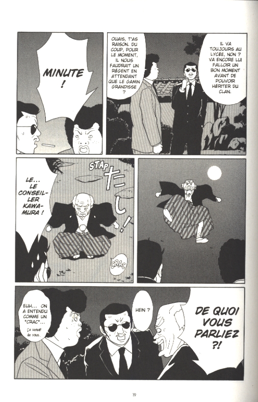« À mon avis, elle n’a pas encore connu d’homme. Évidemment, elle est tellement belle qu’une flopée de mecs devraient lui tourner autour. Mais comme elle appartient à une famille du Milieu, la plupart des types s’enfuient la queue entre le jambes. » Kyôtarô, lieutenant du clan et qui (contre toute logique) croit dur comme fer au pouvoir de séduction de sa mam’zelle.