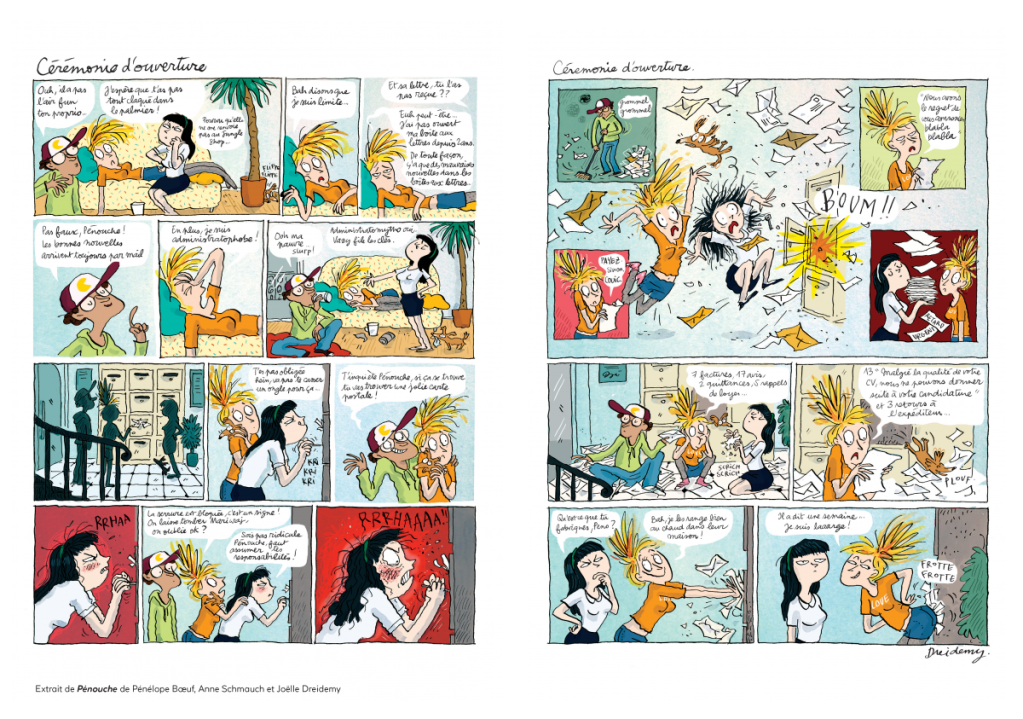 Quand on regarde la couverture, on pourrait que c’est une bande dessinée pour adolescentes. Et pendant la lecture, on pourrait se demander aussi. En effet, Pénouche a bien 25 ans mais est-ce qu’une ado de 16/18 ans se comporterait différemment? Nathan Bande dessinée propose une tranche d’âge à partir de 15 ans et plus. Cela interroge sur qui est la vraie cible. Pourtant être majeur ne signifie nullement même, pour une femme, qu’elle est une fée du ménage ni de la cuisine. Ce n’est pas inné malgré ce que l’on veut encore nous faire croire. Faut-il avoir un certain âge pour rêver de rencontrer le gars parfait qui serait une gravure de mode? Qu’importe ce qu’il a sous la caboche. On entend déjà dire que toutes les femmes ne sont pas futiles et superficielles ou pas que futiles et superficielles. Oui, c’est vrai mais quand même. Sinon cela ferait bien longtemps que des magazines comme « Biba » ou « Elle » auraient mis la clé sous la porte. Anne Schmauch et Pénélope Boeuf ont choisi de s’en amuser pour faire rire les lectrices. C’est léger et cela se lit sans aucune prise de tête. Côté graphisme, Joëlle Dreidemy, propose une approche de plus en plus dans la littérature bd jeunesse. Cela évoque assez le travail de Magali le Huche dans la série avec « Mauve » et « Verte ». Sans omettre la grande prêtresse de la bd adulte, Claire Brétecher, avec une démarche toute autre. Au niveau des couleurs, c’est joyeux, festif et rempli de bonne humeur. Le trio de créative ont su mettre en commun leur passion pour le féminisme, l’humour et la dérision. Un moment sympathique qui se dévore d’une traite.