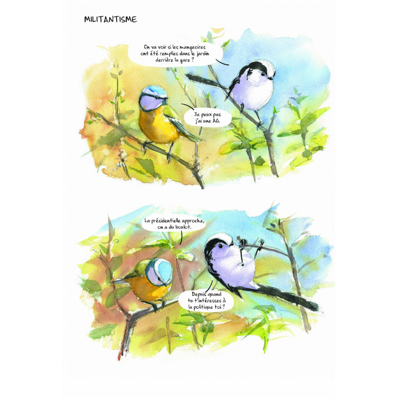 Pour mieux comprendre qu’est-ce que la cosmologie du futur, il faut comprendre le terme cosmologie. Wikipedia la définit de la façon suivante : la cosmologie est la branche de la physique qui étudie l’origine, la nature, la structure et l’évolution de l’Univers. Un ensemble d’éléments cohérents qui forment un tout complémentaire et interdépendant. Pourtant, on divise de façon net et précise avec d’un côté l’homme qui est au-dessus de tout et le reste qui doivent être à sa disposition. Alessandro Pignocchi veut que l’on prenne conscience du lien qui nous unis à ce qui nous entoure. La nature va prendre parfois sa revanche si on ne modifie rien. On s’amuse avec une grande délectation de la folie douce qui touche les mésanges et autres petits oiseaux. Comment ne pas s’éclaffer quand on apprend que des politiques sont morts attaqués par des volatiles. Et surtout que cela dissuade d’autres hommes à vouloir devenir président. N’y voyez pas « Les oiseaux » d’Hitchcock d’autant plus quand on observe la délicatesse de la représentation des moineaux par le dessinateur. Par contre, ils sont partout et voit tout. Pourquoi ne pourraient ils pas être des acteurs du changement? Le scénariste poursuit sa démarche philosophique avec le regard anthropologique d’un jivaro sur la société française. Par contre, il va aller à l’encontre des principes de cette science. Il va ramener un président dans sa communauté. Les imaginaires se confrontent pour mieux en rire. Une approche originale qui nous pousse à aller plus loin dans notre réflexion sur le rapport à l’autre. La postface est d’une grande éloquence donnant des explications plus approfondie sur la vision de l’artiste.