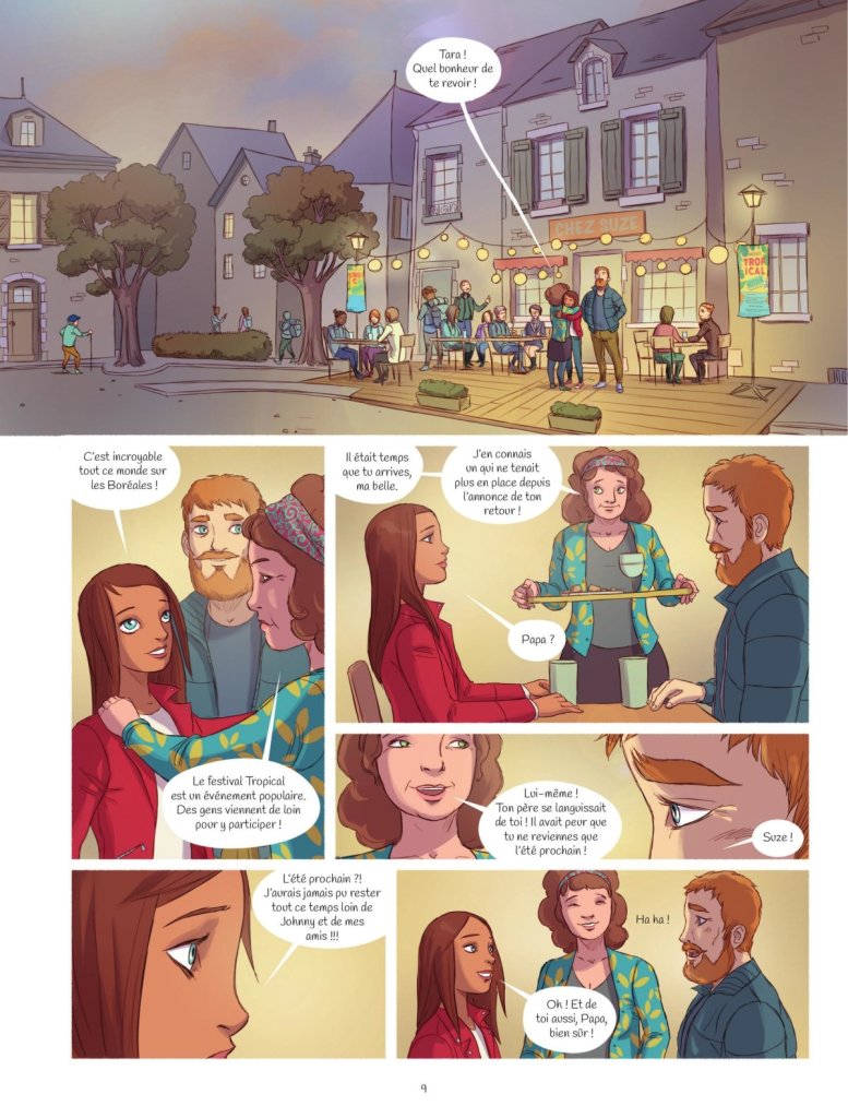 Quel plaisir de retrouver le trio créatif dans une nouvelle aventure de Tara. Après avoir abordé le recyclage sur une île bretonne, maintenant ils évoquent le manger local. Le principe de la terre à l’assiette prend ici tout son sens. Pourquoi faire un festival en automne sur des fruits tropicaux en Bretagne? D’autant plus, quand il existait un festival d’automne qui permettait de valoriser la production local. Ainsi on met un coup de projecteur sur la difficulté de survie économique des producteurs. Même s’il y a moins de touristes pour acheter leur production, les fruits et légumes eux continuent à pousser. Les locaux s’intéressent à des produits venus du continent, cela semble absurde. Anne-Gaëlle et Gwénola Morizur propose une alternative. Bien que cela soit le sujet fil rouge de la bande dessinée, elles n’oublient pas de raconter les turpitudes d’une adolescente qui doit faire face à son égo et ses hormones. Aucun doute que les lectrices vont s’identifier à elle. Au niveau graphique, Séverine Lefèbvre s’affirme dans son graphisme et surtout dans la mise en page très dynamique. Elle occupe tout l’espace sans obligatoirement laisser des espaces blancs. Pour le dessin par contre, certains jeunes risquent d’être dérouté par rapport à des publications jeunesses assez formatés et lisses. Ici les personnages ont une identité différentes tout en étant très réaliste. L’ensemble est très cohérent et plaisant. D’ailleurs, on a hâte de lire la suite.