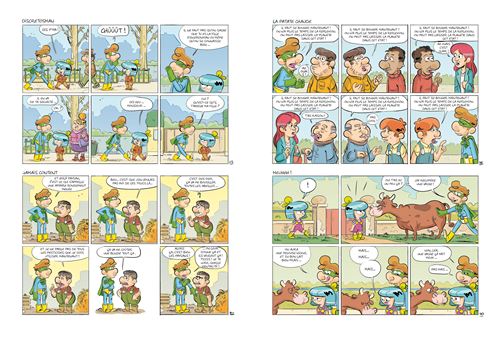 L’adage dit qu’il faut former les enfants pour qu’ils forment leurs parents. C’est ainsi que l’on a formé les enfants à la lecture, l’hygiène, aux dangers de l’alcoolisme… Dorénavant, maintenant que ces sujets sont bien maîtrisés on passe à des nouveaux. L’écologie apparaît à l’école avec l’enseignement du tri sélectif, la protection des animaux, les déchets dans la mer… Afin de rester dans cet esprit de transmission intergénérationnelle, Bruno Madaule et Thomas Priou proposent les aventures d’un duo père fille. Ici c’est la petite fille qui forme les adultes à réfléchir à la nature et leur rapport à la terre. Elle interroge son père avec qui elle vit mais aussi d’autres de ses proches. Avec des remarques, des provocations, elle veut bousculer les esprits. La preuve, le père, Jean-Claude, va mettre un costume vert et tente quelques actions. Bien entendu, elles vont échouer ou ne sont pas adaptées à la situation. Les gags restent assez courts ce qui facile l’accès et sa compréhension. La lecture est adaptée aussi bien aux adultes que les pré-adolescents. L’absurdité fait rire et parfois fait réfléchir. Les thèmes abordés sont très nombreux comme le réchauffement climatique, la circulation à vélo, les déchets jeter dans la nature, les vaches émettrices de méthane, la déforestation, la création d’un compost, la plantation de légumes… Léa va même se mobiliser avec ces copines qui font aussi bien des manifs que des projets de démantèlement d’un McDo. Les jeunes agissent concrètement, ils ne restent pas à râler à la maison avec leur smartphone. Est-ce représentatif? Je laisse chacun de faire son avis.