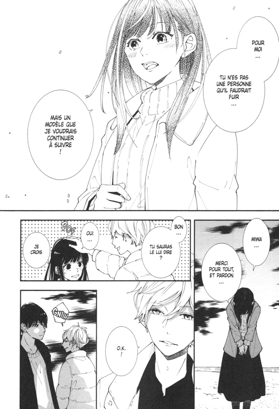 Deux garçons tentent de conquérir le coeur de Tsukasa. Miwa et Matsuoka ont chacun leur technique. Un qui lui dit toujours qu’il l’aime et un autre plus timide. Mais le doute n’a guère sa place. La demoiselle sait déjà pour qui palpite. Chacun apprend à analyser ce qu’il ressent. On peut être honnête sans blesser les autres. Il faut être en accord avec soi. Difficile à faire et à dire. Toutefois au bout de la réflexion se cache une jolie surprise. Tout est dit en deux tomes. Même si on se demande ce que ressent vraiment Miwa. Il évoque être éventuellement qu’il est asexuel ou aromantic. Est-ce une façon élégante d’éviter de trop s’attarder sur ce qu’il ressent vraiment? On aurait aimé rester encore un tome de plus avec ces petits jeunes pour voir ce que l’avenir leur réserve.
