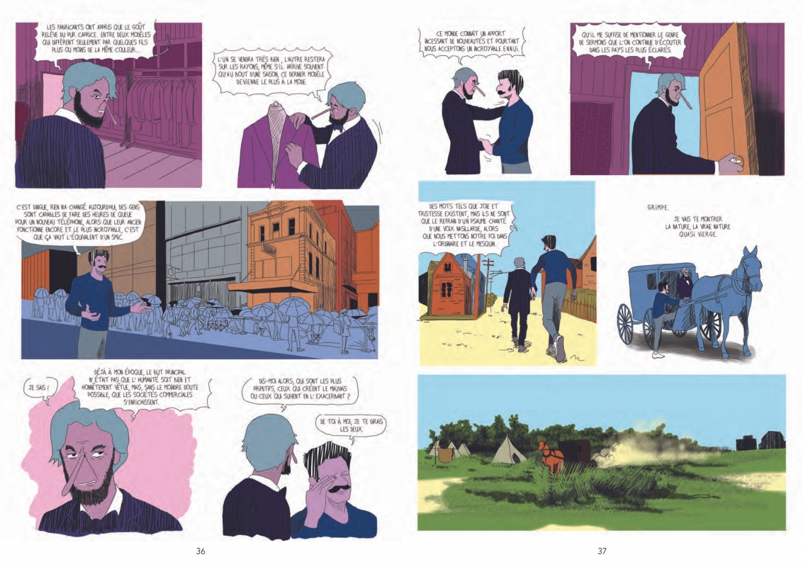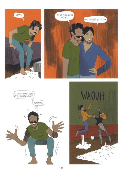 Henry David Thoreau avec « Walden » revient sur le devant de la scène avec la nouvelle prise de conscience écologique. L’homme qui s’est retiré dans la forêt pour se reconnecter à la terre fait des émules. Cédric Taling fait parti de ces individus qu’il a impacté des siècles plus tard. Le créatif met ses questions et ses doutes en parallèle de celle de l’auteur. D’ailleurs, il lui donne la parole en le faisant interagir avec son alter-égo. Pour plus de vraisemblance, il intègre des citations de l’ouvrage. Des discussions avec des amis montre les limites de la démarche écologique. Comment bien agir? Comment agir avec cohérence? Que de doute, sans vraiment d’actions possibles. Sauf qu’un ami leur propose un bout de terrain pour construire une maison comme ils voulaient. Enfin, un encrage plus concret qui s’offre à ce couple bobo parisien. Bien que la réflexion soit très encrée dans la réalité, on adhère moyennement. Les préoccupations concernent un cadre social très particulier et pas très représentatif. Au niveau graphique, ça pique un peu les yeux. On se demande pourquoi certains personnages ont des nez qui ressemblent à Pinocchio. Les aplats de couleurs ne donnent pas envie d’explorer la nature. A moins qu’il faut consommer du LSD. Un message important qui ne peut laisser le lecteur insensible.