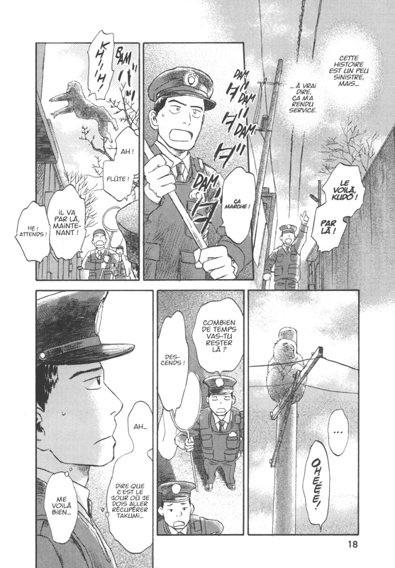 On pouvait se demander si Yuki Urushibara allait arriver à renouveller son récit. Est-ce que l’on allait rester à quelques historettes avec des flows? Et bien non. La mangaka a su proposer des rebondissements pour attiser la curiosité du lecteur. Notre héros que l’on adore suivre n’est pas de cette dimension. Hirota a suivi un flow comme ça voilà plusieurs années. Quand ce flow étrange est réapparu qui de plus normal de retourner chez lui. Ainsi apparaît les deux hommes des deux dimensions comme deux Chima une de 35 ans et l’autre de 12 ans. A eux de trouver leur place et ce n’est pas forcément celle d’origine. Une expérience assez amusante qui se pose comme un voyage initiatique. Les flows apparaissent toujours pour de bonnes raisons. Est-ce que cela veut dire que Chima a toujours rêver secrètement de profiter de sa jeunesse? Etre adulte implique avoir beaucoup plus de responsabilité et de contraintes. Est-ce mal de vouloir jouir de la vie d’une certaine manière? Nous en saurons plus dans les prochains tomes. Espérons du moins qu’il y aura une suite. On s’est attaché à ces personnages si gentils et à l’écoute des autres. Nous assistons à une parenthèse humoristique avec un flow où l’on voit des poissons nager dans la forêt à côté du temple. Qui en est responsable? Shachô qui a adore le poisson frais? Pas du tout, le coupable est dans l’autre camp. Léger et drôle comme il faut. Tout comme les autres aventures avec le père célibataire et son fils et le vieux pêcheur qui détestait avant les chats. Des récits charmants et mignons qui fait plaisir à lire.