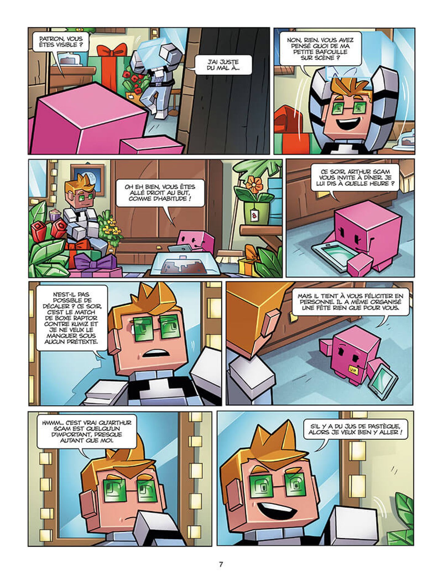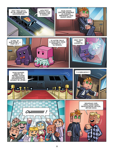 On l’avait déjà remarqué dans les deux tomes précédents, Fuze et Jean-Christophe Derrien aiment parler du monde de l’entreprise. D’ailleurs, ils ont adapté l’univers de la chaîne youtube de Fuze III en bande dessinée. Et le thème principal tourne autour d’une structure gérée par un idiot hautain et prétentieux. Par conséquent, il est toujours à même de dire et faire n’importe quoi tant qu’il garde sa vie confortable et ses privilèges. Son assistante, Framboise, s’occupe de tout et rattrape toutes les bourdes. Pour créer un chamboulement entre les deux on trouve Didier, un homme de ménage assez simplet, plein de bonne volonté. Un ensemble assez représentatif des dynamiques au sein des grandes organisations. On pourrait croire que les scénaristes veulent former à un esprit critique les plus jeunes à des notions d’économie et de posture sociale. Ce tome porte un regard encore plus acerbe sur les enjeux de pouvoirs et le mépris des salariés. On note les phrases suivantes : « Ce sont les affaires. Il n’y a aucun sentiment dans le capitalisme ». Tout est dit simplement et directement. Manger ou être manger. Aucune autre alternative? Le monde du commerce se souligne par l’usage d’un vocabulaire très adapté et précis : monopole, leader, marché… On ne doute pas trop que le lecteur comprenne. Mais tout se fait à travers des aventures improbables, de l’humour et des références à la culture populaire. Cela peut être aussi bien « Le seigneur des anneaux » que les 2B3 ce qui souligne l’étendu des domaines de clin d’oeil. Au niveau graphisme, Ornella Greco reste fidèle à l’univers en cube aux formes arrondies avec des couleurs en aplat et dynamique de Javier Mena.