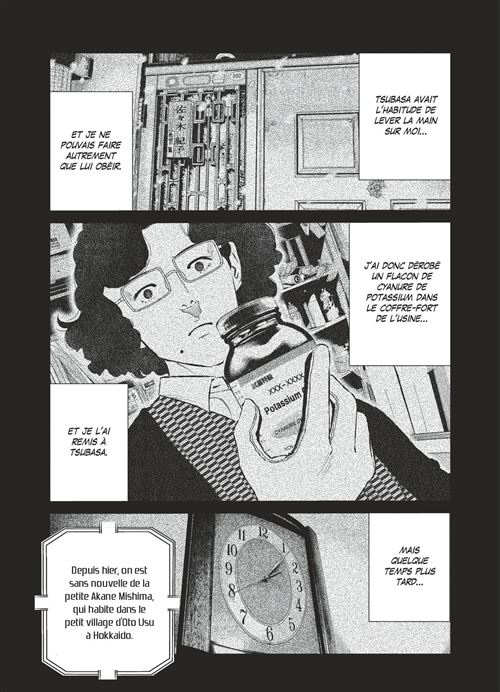 Shin ne baisse pas les bras par rapport à sa mission pour comprendre ce qui se cache derrière ces meurtres. Il sait qu’il va avoir des informations complémentaires qui pourraient tout changer. Seulement une personne possède les réponses et fait en sorte de garder les secrets. Suzu doit faire face à sa belle-mère qui est une femme odieuse. Tuer des gens ne l’effraie pas le moindre du monde. Sa cruauté est marquée sur son visage. Son rôle commence à s’affirmer. Suzu peut-elle garder l’enfant de celui qui est à l’origine de tout ça? Si un jour la vérité éclate, pourra t’elle protéger sa progéniture des médias et de la honte qui va tomber sur elle? Kiko Sasaki, la mère du défunt Tsubasa qui avait enlevé la petite Akane, méritait-elle de mourir ainsi? Un nom se fait entendre. Le lecteur lui n’a pas la donnée. Il suppute uniquement. Yuki est de nouveau sur l’affaire en tant que journaliste. Quelque chose l’a lie à Shin. Le passé arrive tout de même à conserver une partie sentimentale de l’autre réalité. A ce contexte, Toshiya Higashimoto rajoute une nouvelle trame dramaturgique car des morts sont prévus à l’hommage pour la mémoire de ce drame. Shin va affronter l’individu responsable. Le suspens se ressent lorsqu’on tourne les pages. On sent bien qu’il y a quelque chose de malaisant. Les dessins torturés, le cyanure de potassium, l’horreur des assassinats… tout cela crée un climat qui met le lecteur assez inconfortable. La page de fin permet à un frisson de nous traverser. Qui peut avoir des globules d’oeil dans la main et en être fier?