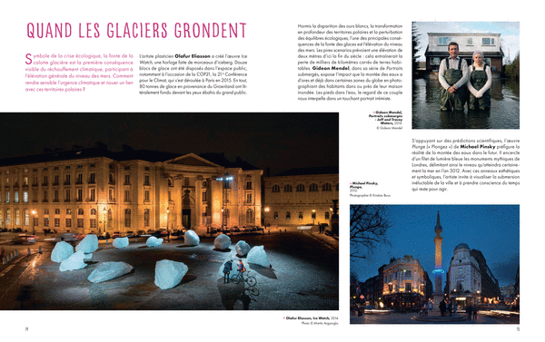 L’ouvrage se structure en 5 catégories où sont répartis les différents artistes d’art contemporains. « Aussi ce n’est pas un hasard si l’écologie est devenue un thème de prédilection des artistes contemporains : il s’agit de l’enjeu majeur de notre temps. » Il faut voir dans les oeuvres un reflet des préoccupations de l’ensemble des citoyens de la terre. C’est aussi une façon de porter un regard sur le passé, faire un constat sur le présent et laisser une trace pour le futur. La conscience écologique prend plus de sens au global. Cela ira parfois plus loin qu’une simple réalisation avec des activistes.