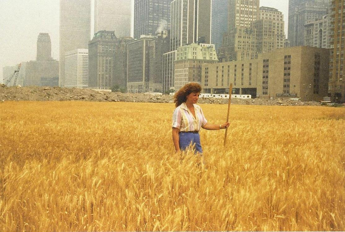 En parlant d’action, on pense forcément à Agnes Denes. En 1982, elle plante un champ de blé, en plein coeur de New-York, entre le World Trade Center et la statut de la Liberté. Elle veut prouver les conséquences écologiques en parallèle des choix économiques. En vendant son blé côté en bourse, elle n’a pas gagné beaucoup.