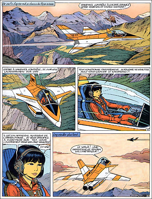 Après quelques semaines, Yoko Tsuno maîtrise parfaitement le Colibri, un avion expérimental. N’oublions pas qu’elle est ingénieure électro-technicienne. A chaque aventure, elle s’autoforme pour être adaptable face à toutes les situations. Donc s’infiltrer, se battre, séduire, répondre à des propos misogyne, piloter un avion unique, brancher une bombe… elle peut tout faire. Quand un imprévu arrive, elle gère rapidement et sans stress. Roger Leloup nous présente une héroïne qui en a dans la culotte. Et en plus, elle n’a pas besoin d’être blonde, à forte poitrine et avec des vêtements très courts. Chose très rare, même de nos jours d’avoir une femme forte et asiatique. Le scénariste insiste ici sur son origine japonaise. Normal car il fait référence au conflit entre le Japon et la Chine, post Seconde guerre mondiale. Bien que les noms des pays soient changés, on voit clairement le lien. Le sujet capital est l’utilisation du nucléaire et des déchets du nucléaire sous forme de bombe. Mais écologiquement, en créant des bombes il n’y a plus de soucis de stockage. Qui voudrait le début d’un conflit mondial? On n’est pas dans un récit vraisemblable. Un gars dans un coin arrive à utiliser le nucléaire semble peu probable. Tout comme cinq personnes qui parviennent à tout organiser pour conserver la paix et libérer les otages. Nous ne sommes pas dans un film avec Jason Bourne. Toutefois les pages se tournent avec plaisir. On retrouve une héroïne exceptionnelle et hors du commun. Elle évoque la bravoure des femmes nippones avec la moitié du drapeau du pays du soleil levant. On constate que visuellement, il y a une évolution. Yoko n’est plus jaune poussin. Par contre, écrire en majuscule les phylactères cela rend la lecture épuisante. Pourtant cela ne va pas me dissuader de poursuivre la relecture de toute la série. Surtout que c’est toujours un plaisir de voir les références à la culture populaire.