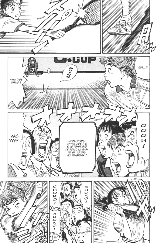 Contrairement aux autres série de Naoki Urasawa ne construit pas plusieurs intrigues en parallèle. Nous suivons simplement la jeune Miyuki faire de son mieux pour gagner une compétition pour éponger les dettes de son frère. La demoiselle est si gentille et attachante, comment ne pas être fâché quand elle doit affronter des personnes malveillantes. Elle est tellement naïve de la vie qu’elle n’y connaît rien ni en garçon ni en contrat de travail et encore moins dans les gens manipulateurs. Quand elle doit faire face à une situation nouvelle, elle ne pense jamais qu’on peut lui vouloir du mal à elle ou sa famille. Les femmes puissantes sont sans pitié. Utako Ohtori lui apprend un coup « la balle infernale » qui l’a fait haïr du public. Choko malgré sa beauté est une chipie de haute volée. Le mangaka arrive très vite à les faire détester. Elles ont un rôle centrale qui devrait devenir plus important par la suite. On est habitué à plus de psychologie et de nuance. Donc cela nous semble un peu trop dans les extrêmes sur les sentiments et les attitudes. On n’a pas le temps de s’ennuyer quand même surtout que nous assistons à une compétition de tennis haut niveau. Bien que nous aurions aimé un peu moins d’éléments répétitifs comme la balle au raz du filet ou dans le restaurant avec son patron. Le tome se termine avant le point décisif. Un choix malin pour inciter à poursuivre la lecture.