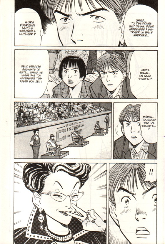 Miyuki Umino est parvenue jusqu’en demi-finale de la Coupe Tokyo Cinderella et affronte Kawada, une joueuse au service redoutable… Mais Miyuki a elle aussi un atout dans sa manche : la « balle infernale », la botte secrète qui lui a été enseignée par Utako Ohtori en personne ! Une technique aussi mystérieuse que puissante… Pourtant, Mivuki rechigne à l’utiliser ! Quel en est donc le secret ?
